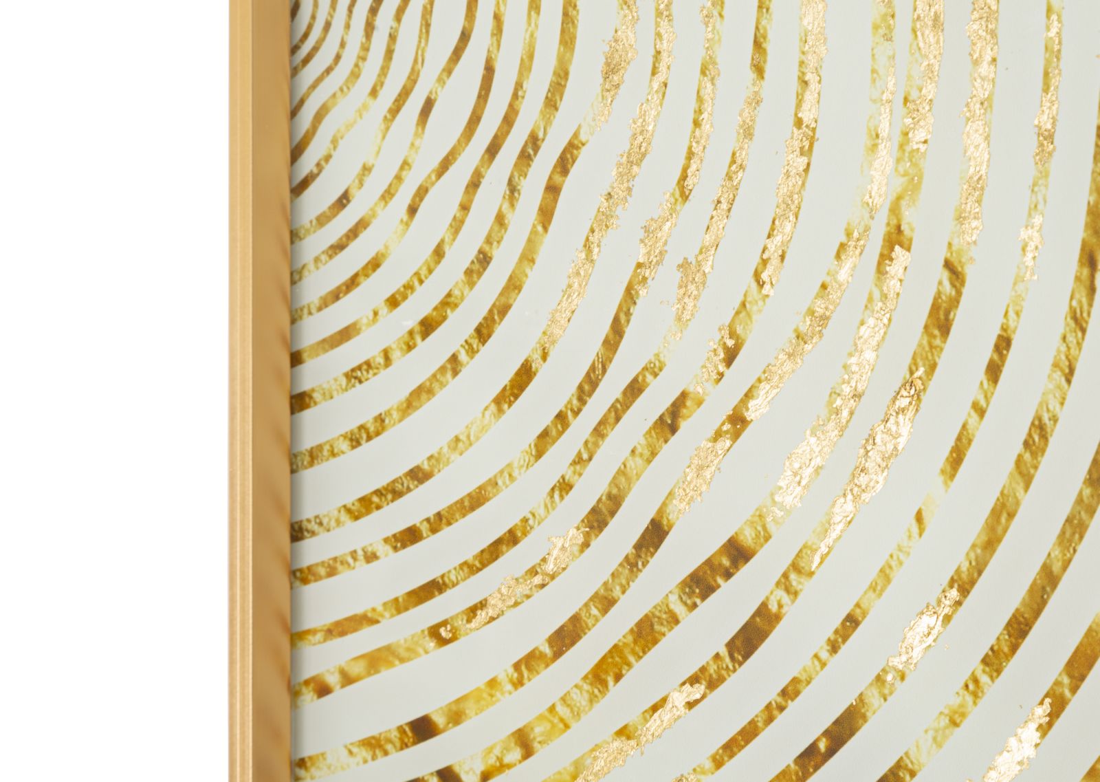 Panneau décoratif en verre avec d'élégantes décorations abstraites. Le panneau est enfermé dans un simple cadre en métal doré.