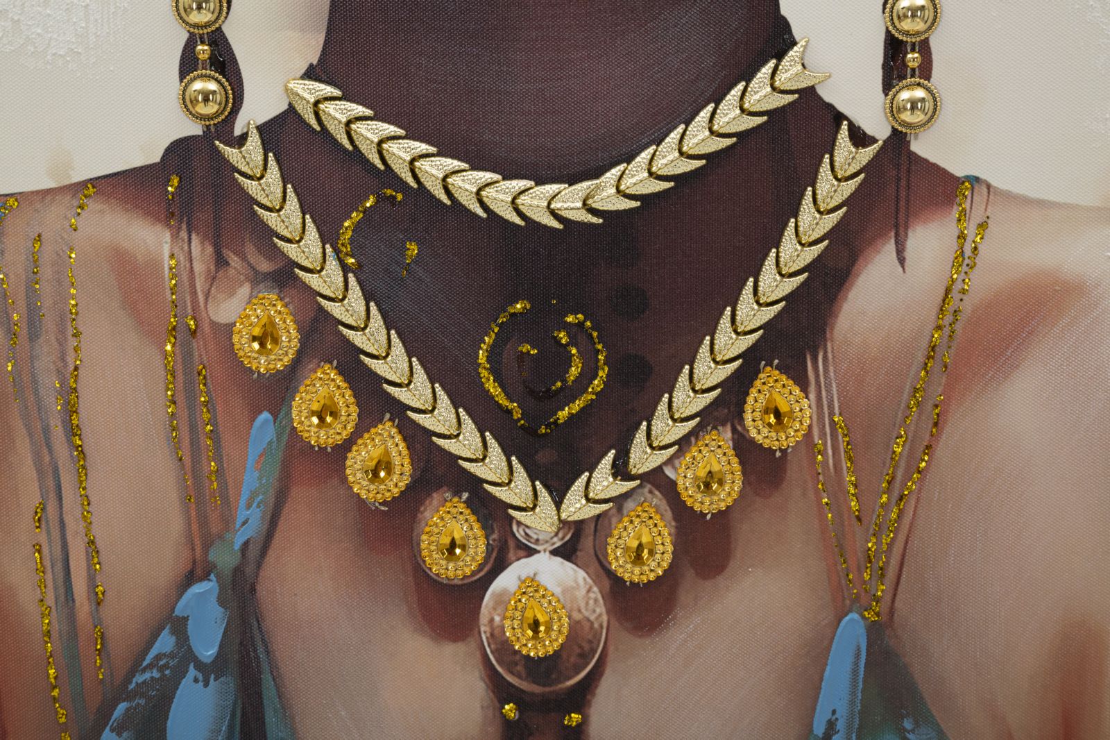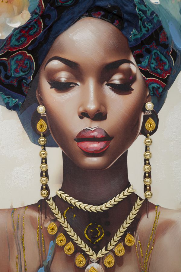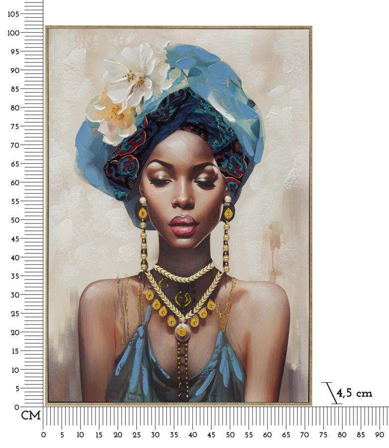 Peinture sur toile avec un cadre en bois représentant une femme en costume traditionnel et un turban. Complet avec cadre en métal doré.