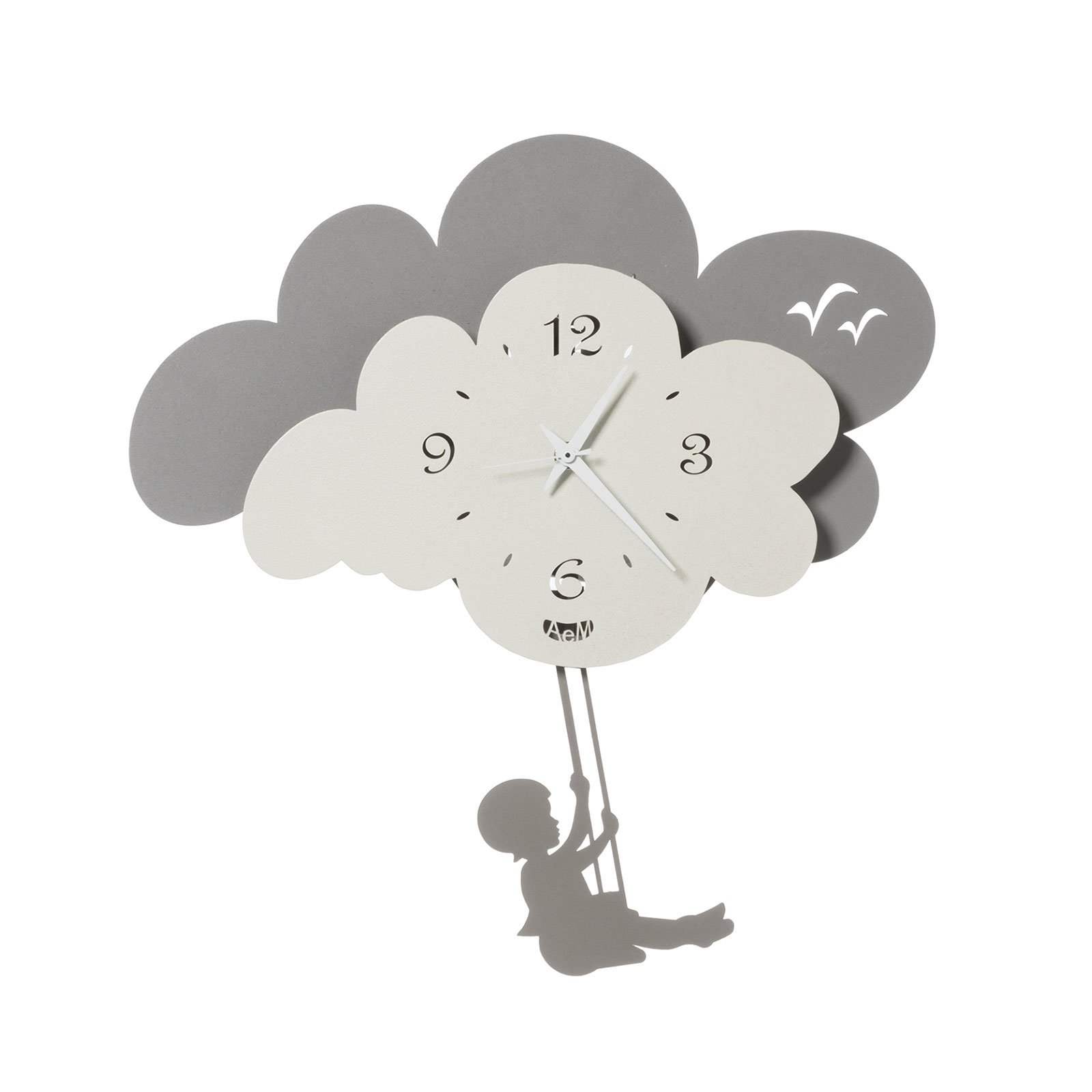L'horloge murale à pendule Nuvola est composée de deux nuages qui se chevauchent et d'une balançoire qui leur pend. L'enfant qui se balance représente le pendule. Disponible en trois combinaisons de couleurs différentes.
