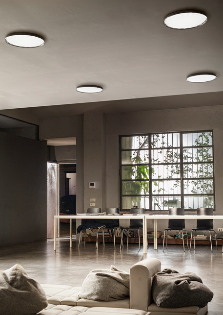 La version suspendue est montée sur un tube rigide, tandis que la version plafond est également disponible avec des accessoires dissimulés pour l'installation sur des surfaces en plaques de plâtre.