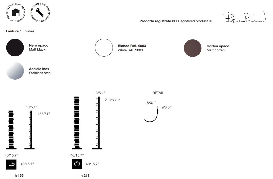 Finitions colonnes et étagères: laqué noir et effet corten mat, laqué blanc brillant RAL 9003, inox miroir avec étagères internes en finition satinée.