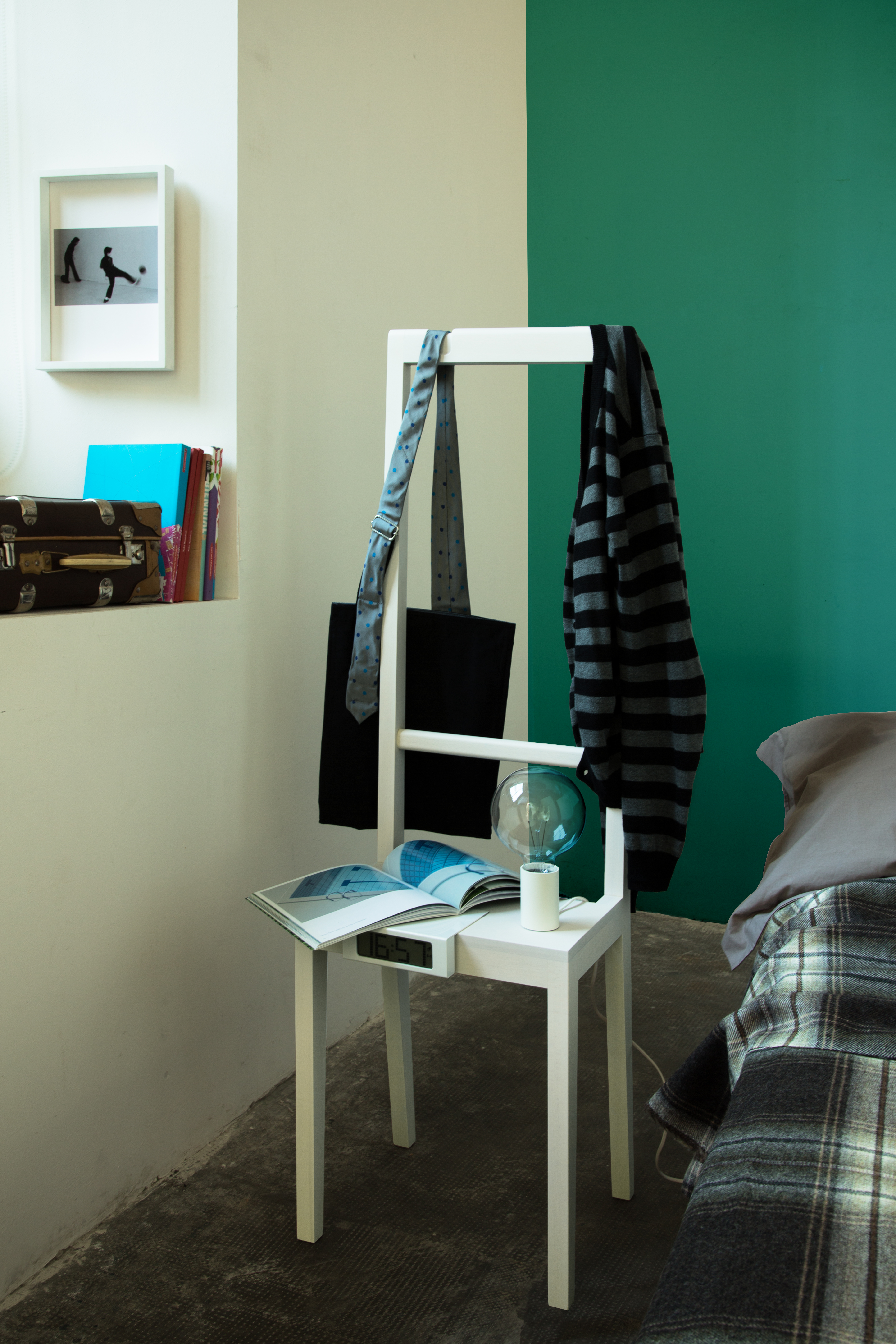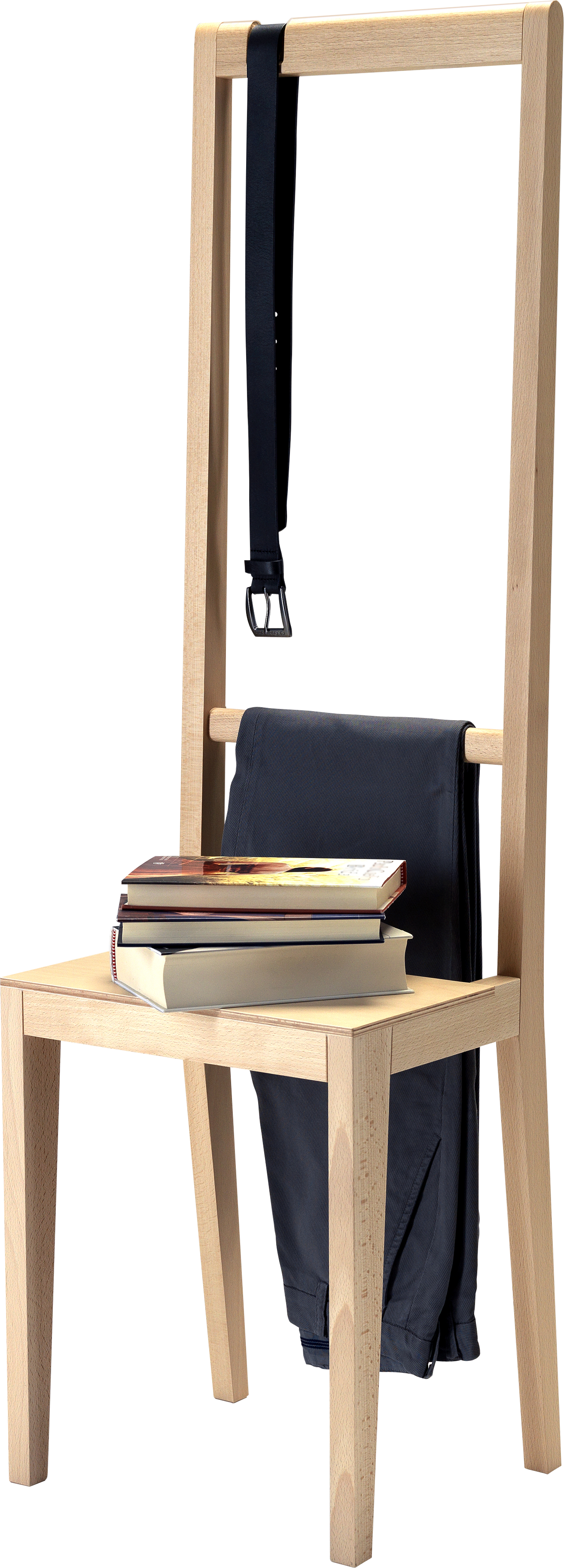 Grâce à quelques petits ajustements, il devient un porte-manteau parfait : le logement supérieur accueille la ceinture, la cravate ou l'écharpe ; la traverse sert à suspendre les vêtements ; la surface d'appui est également utile pour empiler des livres et des magazines.
