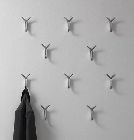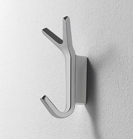 Porte-manteau mural en aluminium poli monté avec vis M4 sur une entretoise, en aluminium poli, équipé de 2 trous pour le montage mural.