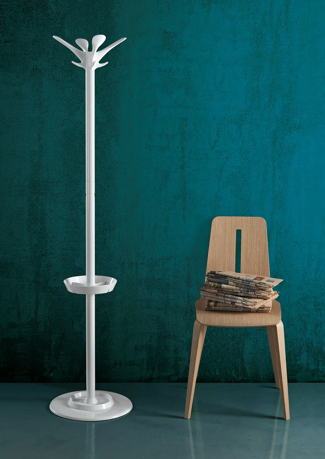 Portemanteau composé d'une base en acier embouti avec des bords arrondis pour éviter d'endommager la surface du sol, peint avec des poudres