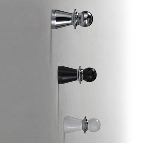 L'objet est composé d'un élément conique disponible dans les versions peintes ou chromées, avec un trou pour la vis de fixation murale, équipé d'un filetage intérieur pour l'agrégation de l'élément bouton, également disponible peint ou chromé.