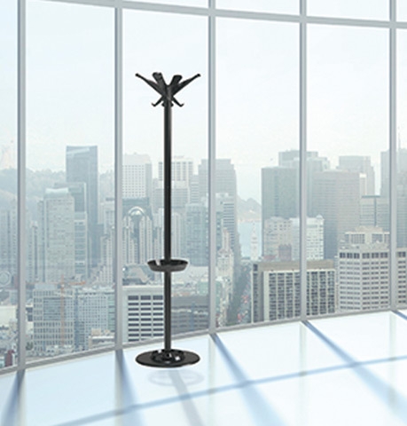 Portemanteau composé d'une base en acier embouti avec des bords arrondis pour éviter d'endommager la surface du sol, peint avec des poudres
