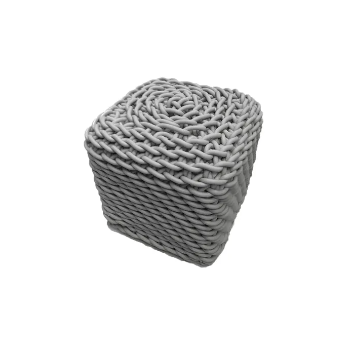 Ces poufs sont tricotés avec du fil de caoutchouc tissé.