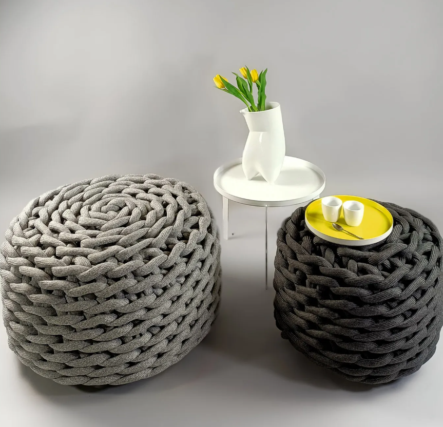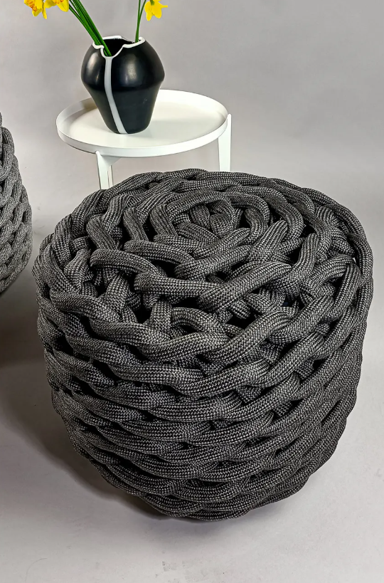 Pouf réalisé avec une corde en polypropylène nouée à la main de 25 mm, allie savoir-faire et résistance.
