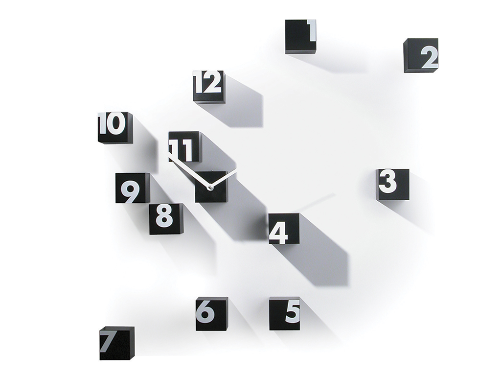 Horloge murale, cubes en polyamide. Mouvement à quartz à piles Horloge avec affichage personnalisé au mur, car les cubes doivent être fixés librement au mur. Les cubes sont disponibles en couleurs noir et blanc.