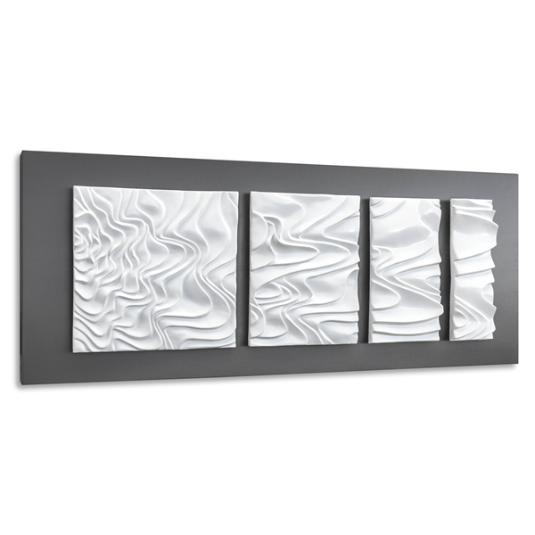 Installation en bas-relief décoré à la main, composé de quatre éléments céramiques composites, de couleur blanc ivoire, monté sur un cadre en toile laquée gris quartz.