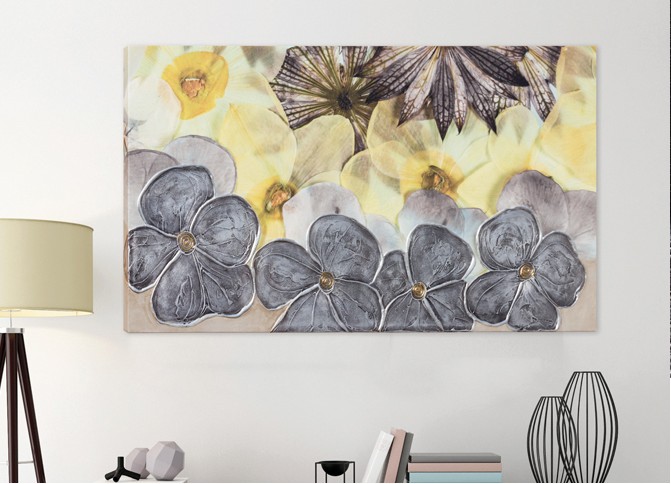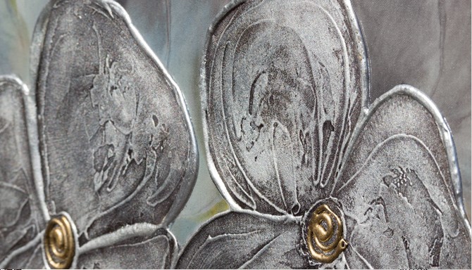 Structure en toile avec des pétales matériques décorés à la main avec des feuilles d'argent.