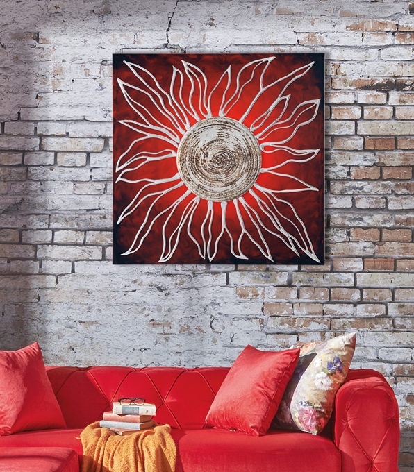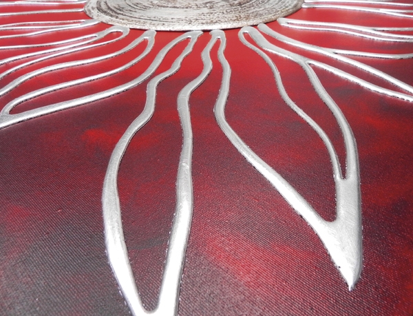 Éléments en relief décorés à la main avec des résines, matière, feuille d'argent sur structure en lin, finition brillante.