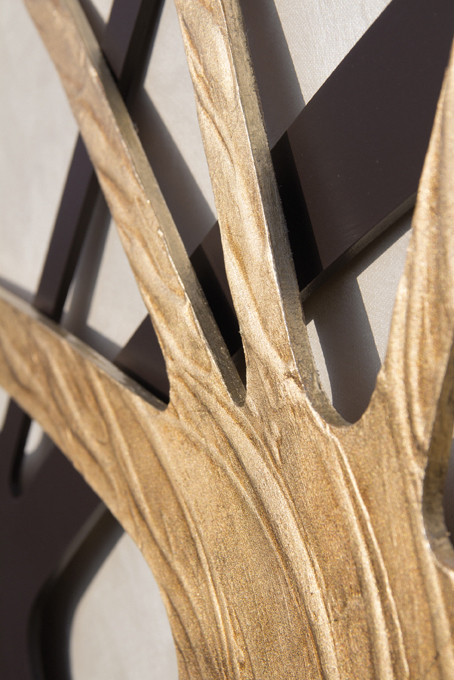 Panneau de toile en nacre avec deux structures courbes superposées, laqué café, décoré à la main sur un matériau en relief et feuille d'or.