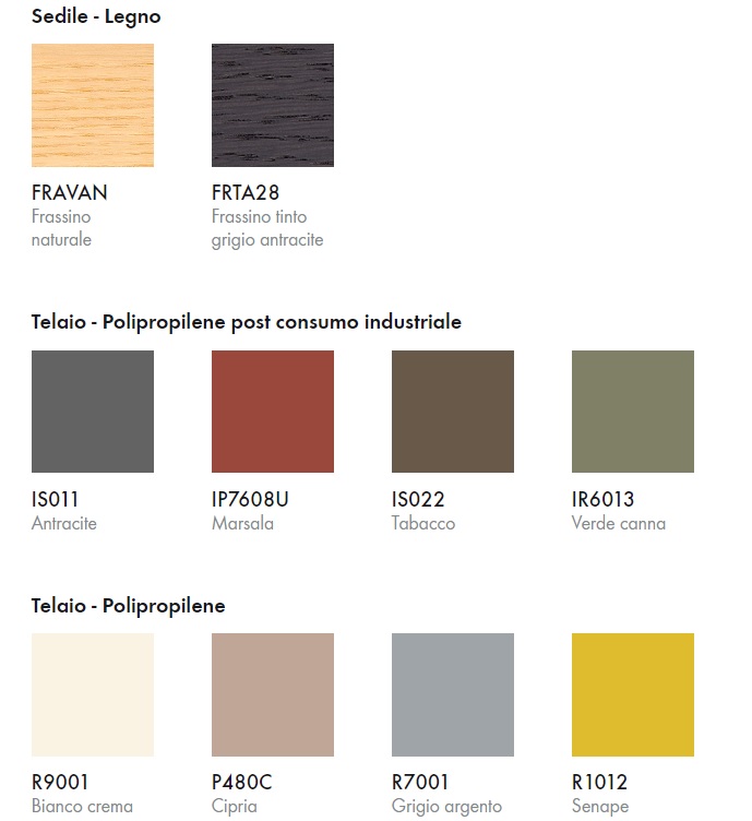 Chaise monobloc en polypropylène recyclé disponible dans une palette de couleurs originale variée. Le siège est également disponible en bois de frêne, offrant une alternative plus élégante au siège rembourré classique.