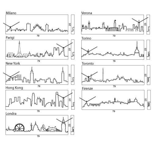 Horloge murale en bois peint. Mouvement à quartz à pile. Villes: Milan, Florence, Turin, Vérone, Paris, Londres, New York, Toronto et Hong Kong.