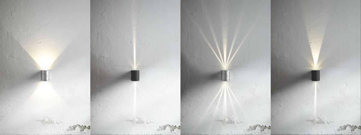 Spot d'extérieur en métal et verre, avec 3 diffuseurs pour 3 types de lumière différents.