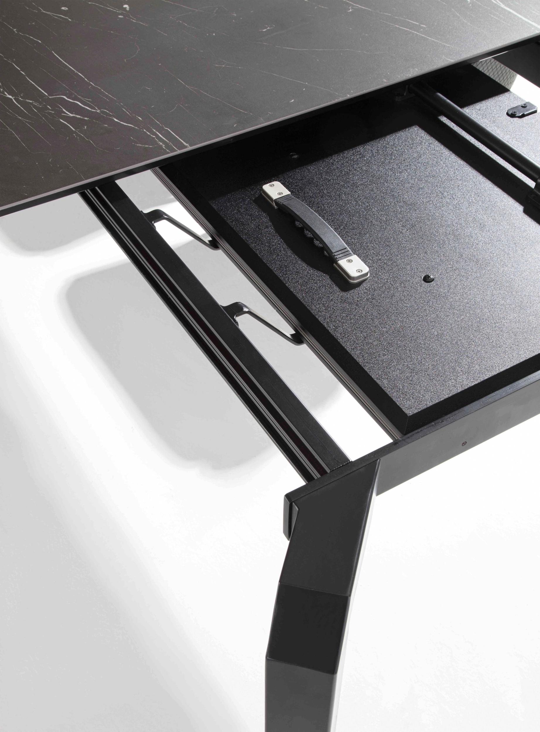 Sa structure peinte en noir offre une prestance imposante, tandis que sa capacité à se transformer en portefeuille, grâce à la céramique sur MDF, en fait un véritable bijou d'ingénierie.