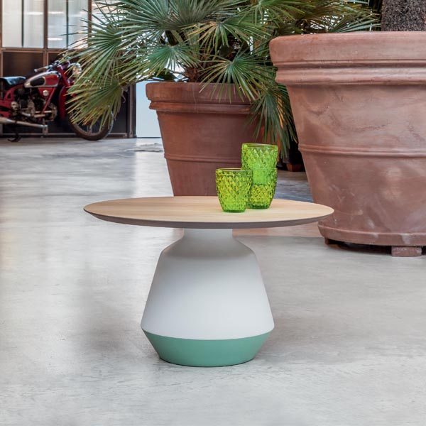 Table basse avec base en céramique et plateau en mdf recouvert de bois.