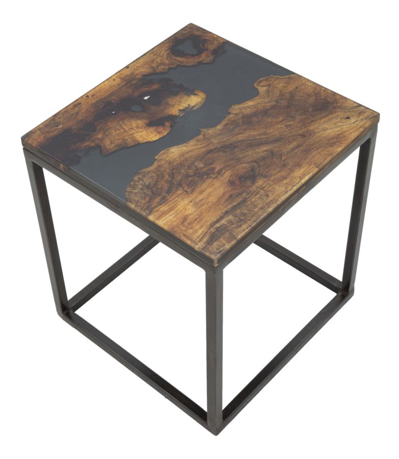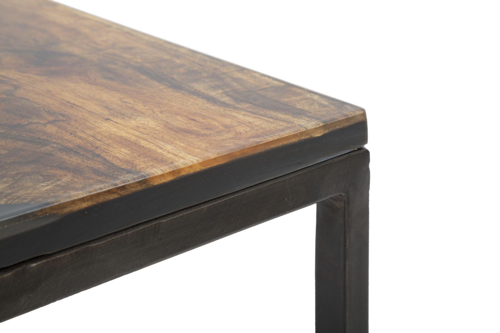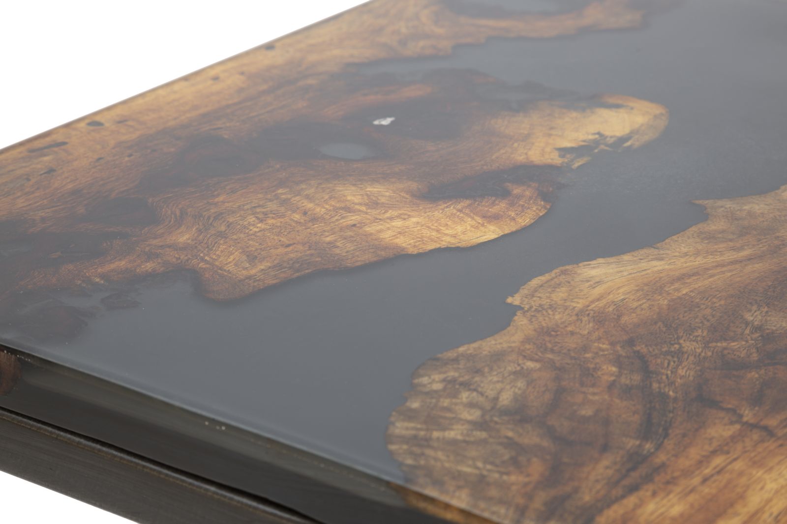 Table basse carrée élégante avec plateau en bois d'acacia massif et structure en métal noir. La finition particulière avec la résine sertie sur le dessus donne une touche de couleur et de modernité à une pièce extrêmement élégante et classique.