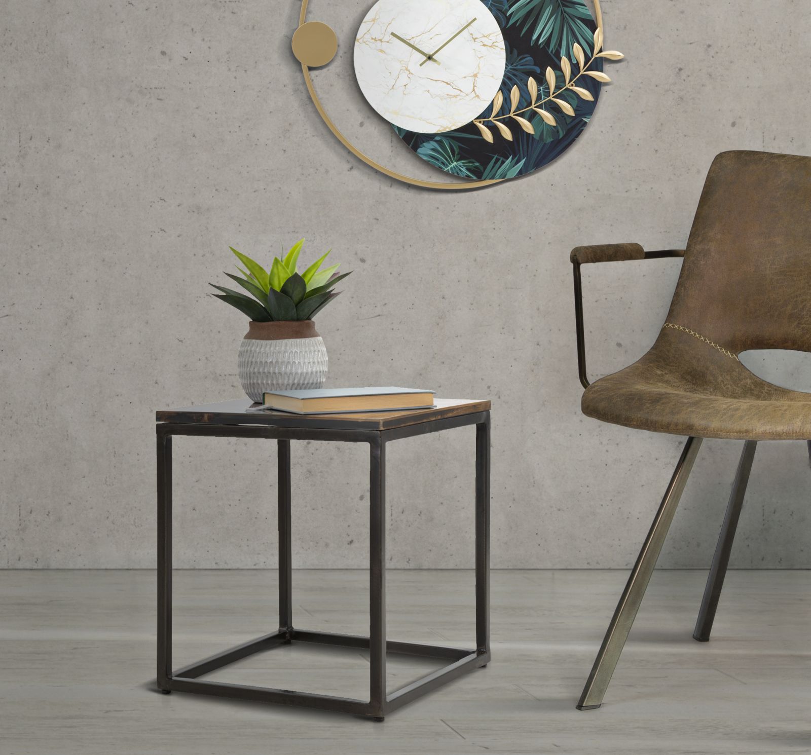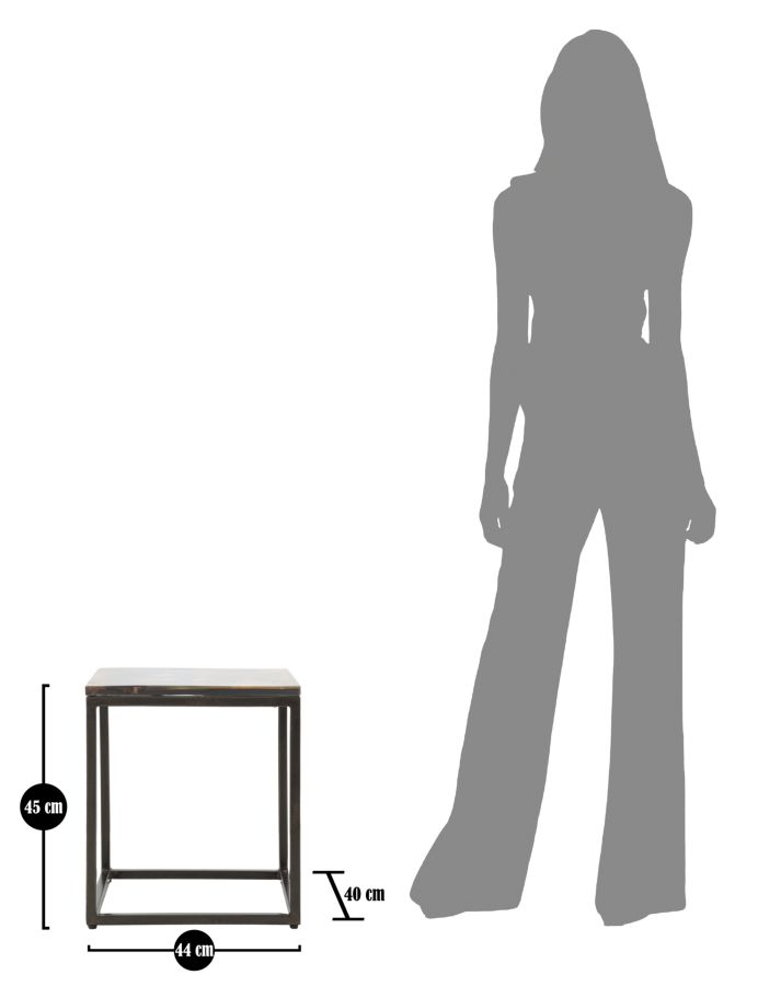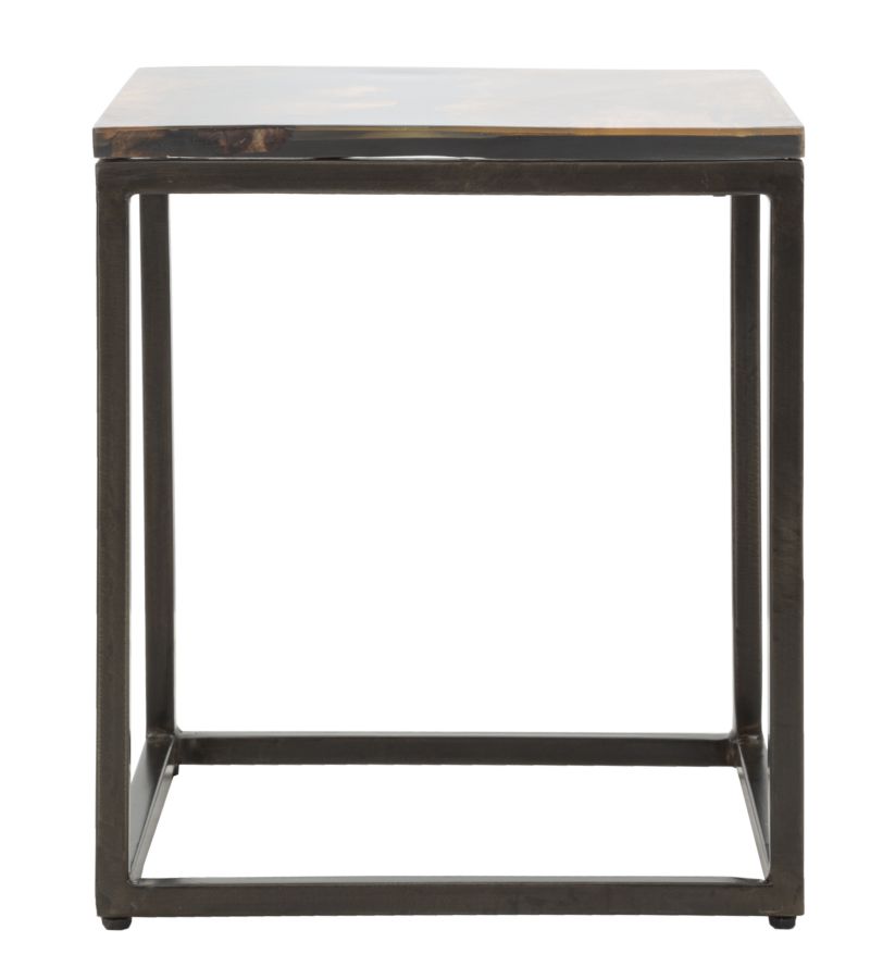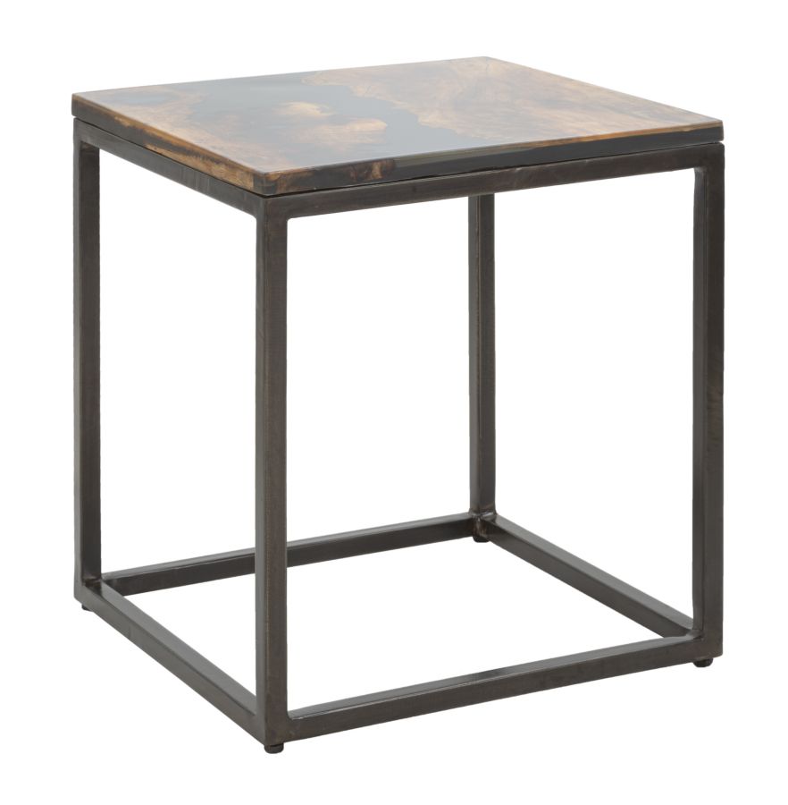 Table basse carrée élégante avec plateau en bois d'acacia massif et structure en métal noir. La finition particulière avec la résine sertie sur le dessus donne une touche de couleur et de modernité à une pièce extrêmement élégante et classique.