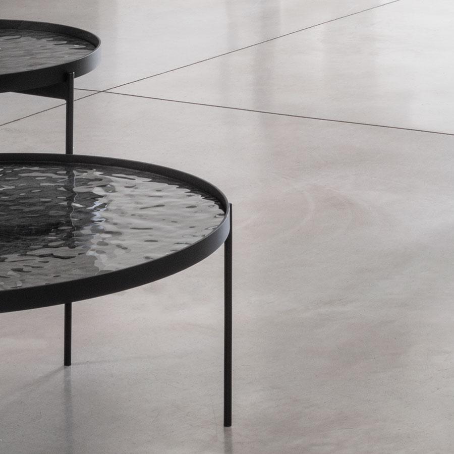 Le design élégant et minimaliste de la structure des tables basses Esprit s'intègre parfaitement au verre sophistiqué, qui peut être forgé ou décoré numériquement avec un effet marbre raffiné.