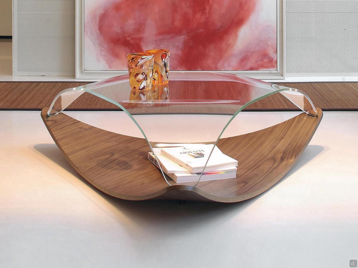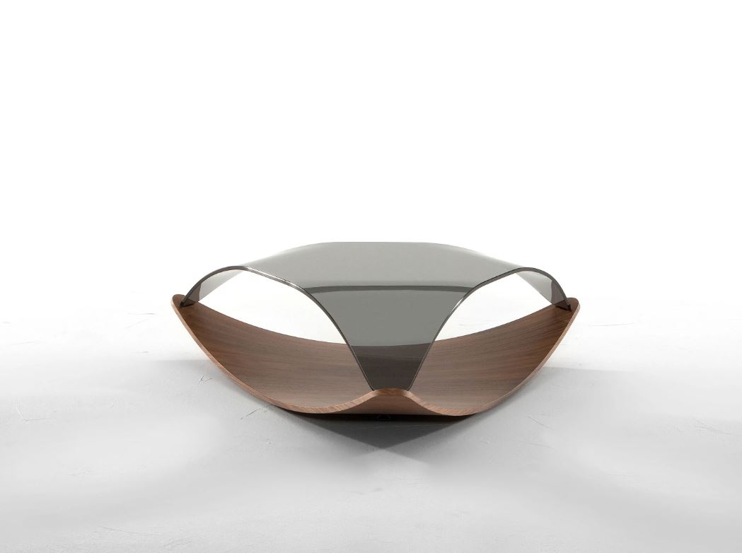 Table basse en MDF incurvé laqué ou recouvert de bois avec plateau en verre incurvé.