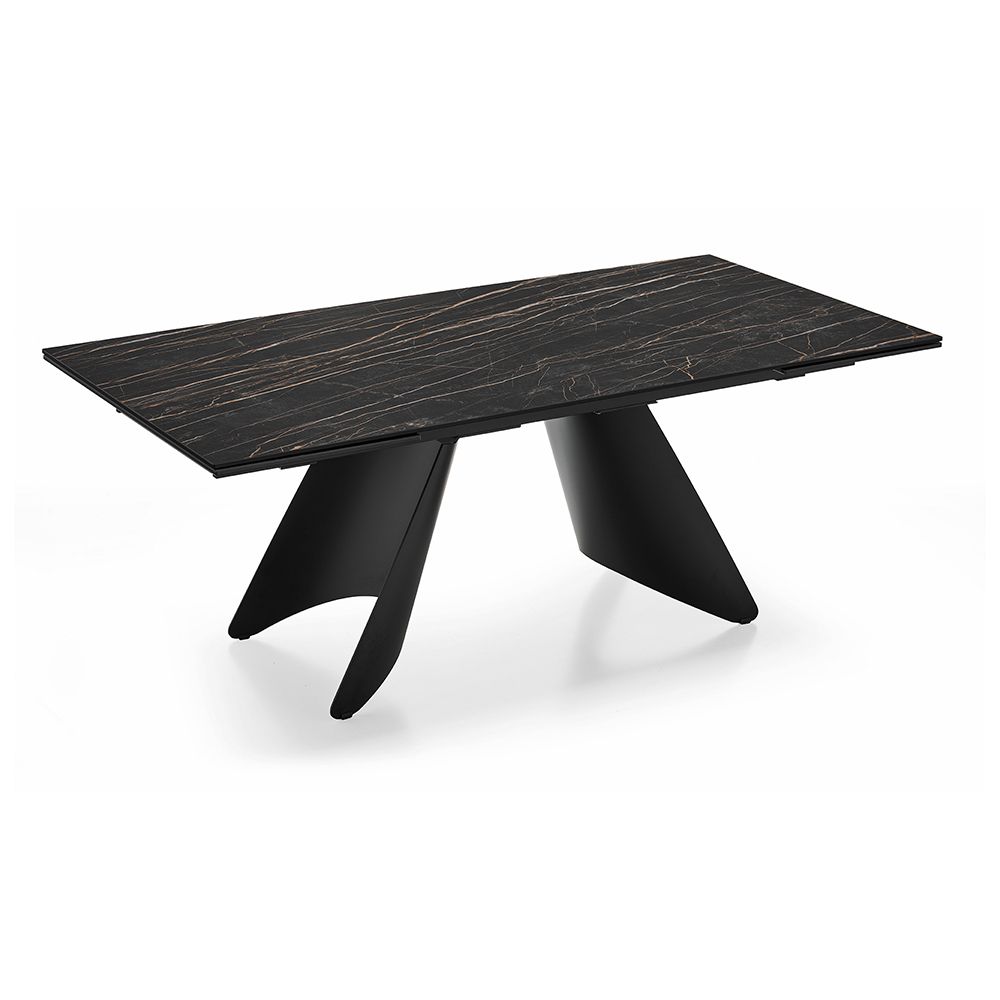 Le plateau de la table est extensible grâce à une rallonge centrale, et est disponible en céramique couplée au verre, offrant une surface élégante et résistante.