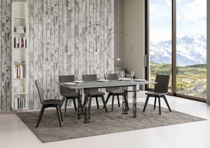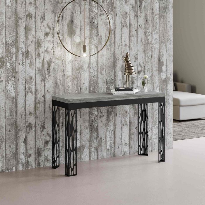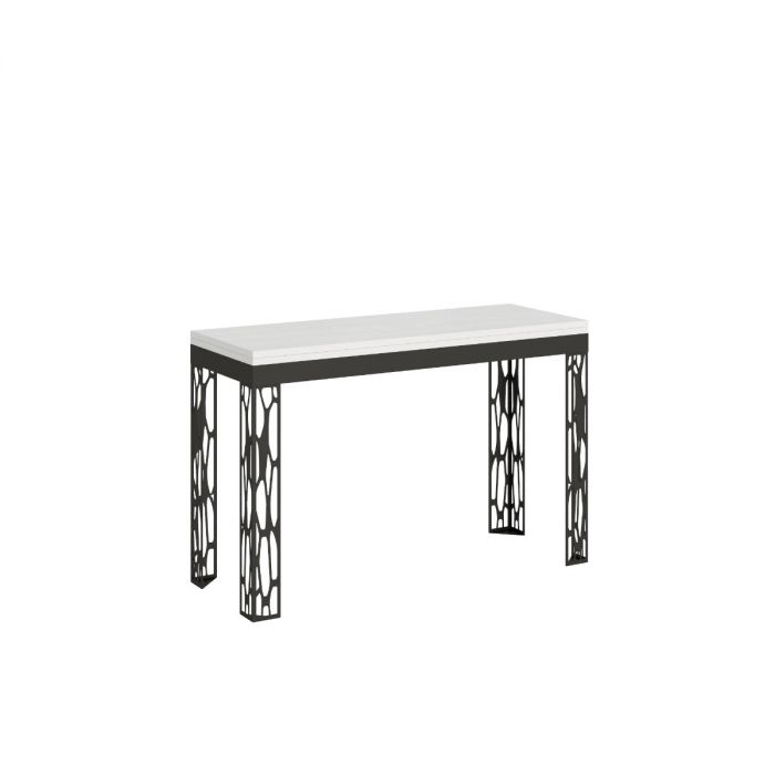 Table pliante avec structure en fer et pieds perforés, au style moderne et original. Ce modèle double sa surface en quelques gestes. Disponible avec une rallonge en option, qui s'insère une fois la table ouverte pour augmenter encore sa capacité.