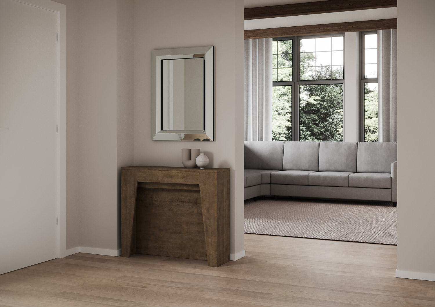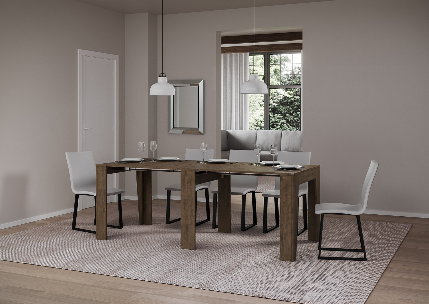 Console extensible Anea, polyvalente et robuste, un complément parfait pour chaque pièce de la maison : entrée, cuisine, salle à manger, salon ou couloir. La console extensible Anea peut être facilement transformée en une grande table à manger pouvant atteindre 211 cm de longueur, pouvant accueillir jusqu'à 10 personnes. Realisée avec des panneaux en mélaminé. Le système d'extensions avec des guides télescopiques en aluminium et le support central inclus rendent la console stable et robuste. Une fois que la console est fermée, les extensions de dimensions 62x86 cm se rangent à l'intérieur de la structure de la console. Produit Itamoby Made in Italy Dimensions: Console fermée: L.90 P.25 H.77 cm Longueur avec 1 extension: 87 cm Longueur avec 2 extensions: 149 cm Longueur avec 3 extensions: 211 cm