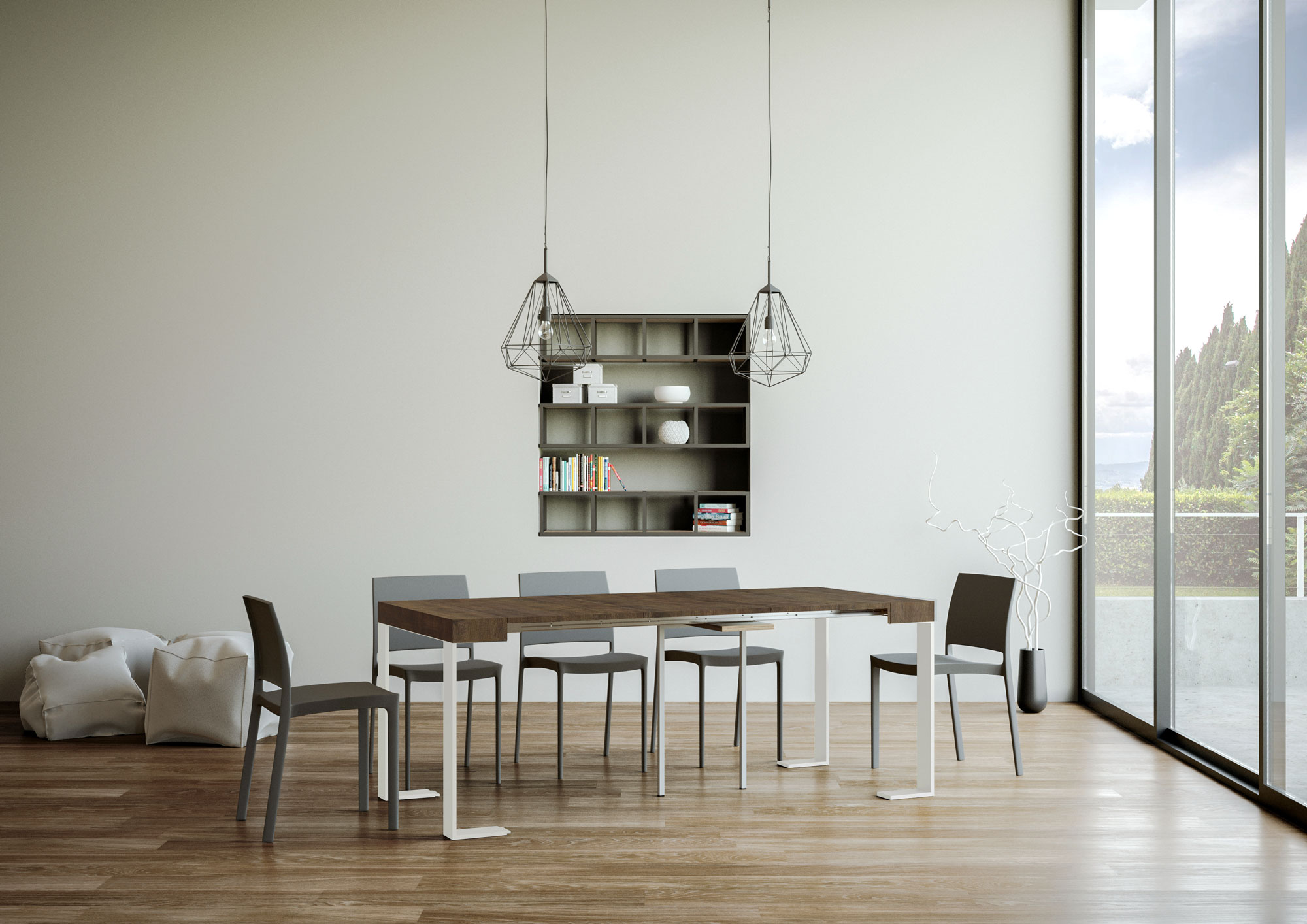 Console extensible Tecno Small, polyvalente et robuste, un complément parfait pour chaque pièce de la maison : entrée, cuisine, salle à manger, salon ou couloir. La console extensible Tecno Small peut être facilement transformée en une grande table à manger pouvant atteindre 196 cm de longueur, pouvant accueillir jusqu'à 10 personnes. Realisée avec des panneaux en mélaminé, pieds en fer. Le système d'extensions avec des guides télescopiques en aluminium et le support central inclus rendent la console stable et robuste. Une fois que la console est fermée, les extensions doivent être rangées ailleurs. Produit Itamoby Made in Italy Dimensions: Console fermée: L.90 P.40 H.77 cm Longueur avec 1 extension: 92 cm Longueur avec 2 extensions: 144 cm Longueur avec 3 extensions: 196 cm