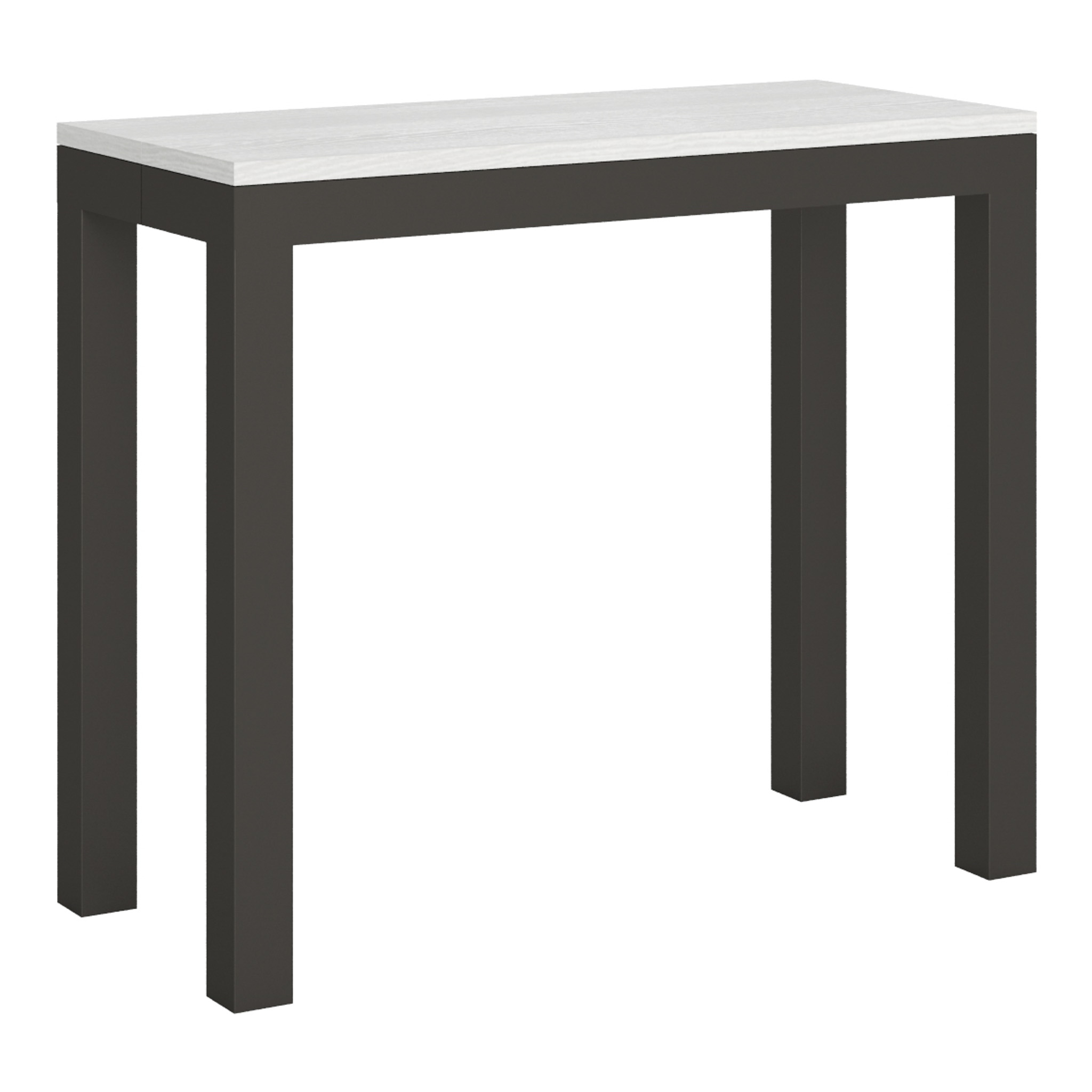 Console extensible Everyday Evolution, polyvalente et robuste, un complément parfait pour chaque pièce de la maison : entrée, cuisine, salle à manger, salon ou couloir. La console extensible Everyday Evolution peut être facilement transformée en une grande table à manger pouvant atteindre 300 cm de longueur, pouvant accueillir jusqu'à 14 personnes. Realisée avec des panneaux en mélaminé, cadre et pieds en fer. Le système d'extensions avec des guides télescopiques en aluminium et le support central inclus rendent la console stable et robuste. Une fois que la console est fermée, les extensions doivent être rangées ailleurs. Produit Itamoby Made in Italy Dimensions: Console fermée: L.90 P.40 H.77 cm Longueur avec 1 extension: 92 cm Longueur avec 2 extensions: 144 cm Longueur avec 3 extensions: 196 cm Longueur avec 4 extensions: 248 cm Longueur avec 5 extensions: 300 cm
