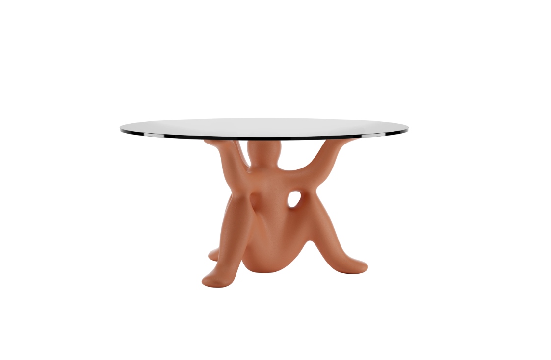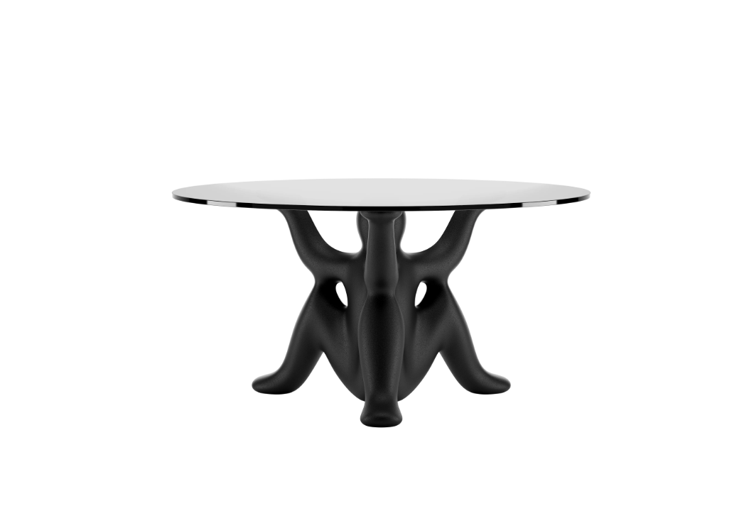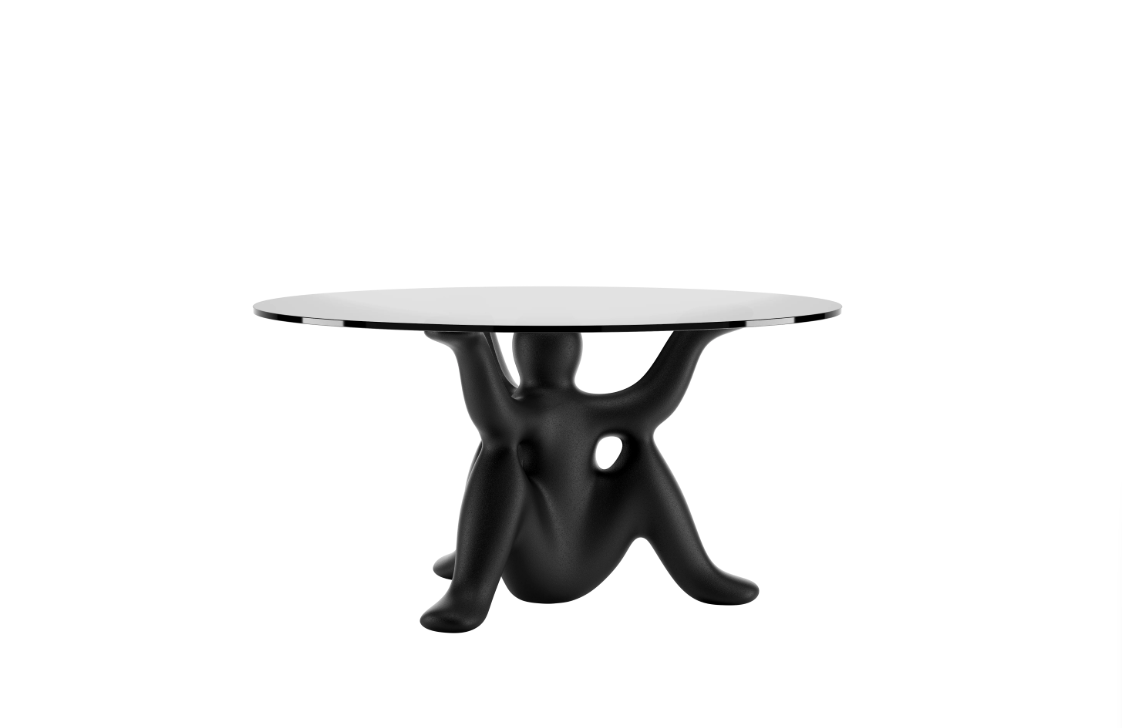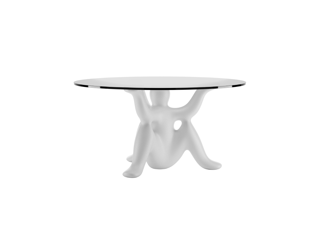 HelpYourSelf est la collection de tables dessinée par Philippe Starck pour Qeeboo, où des génies fantastiques soutiennent avec ironie et force un grand plateau en verre.