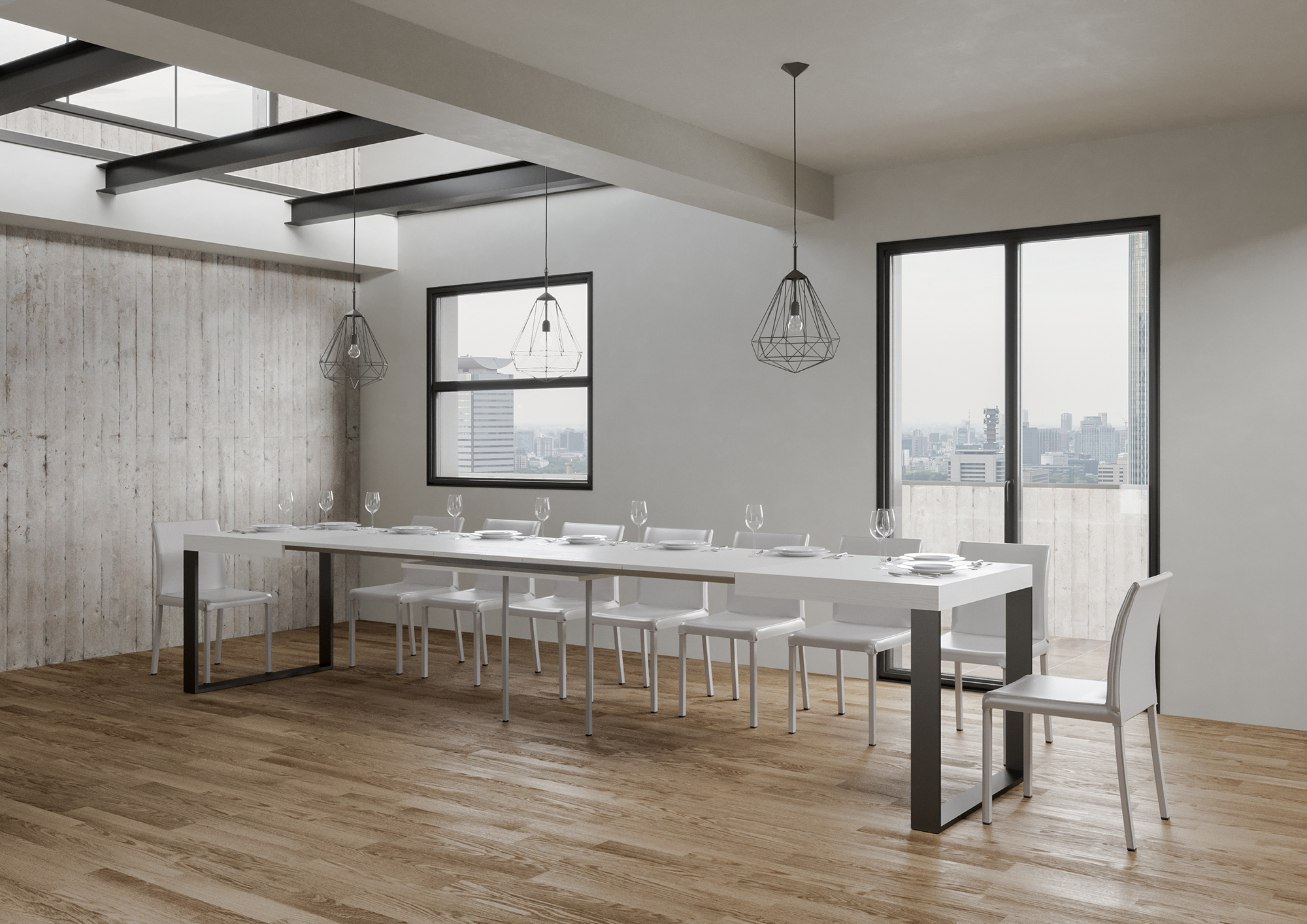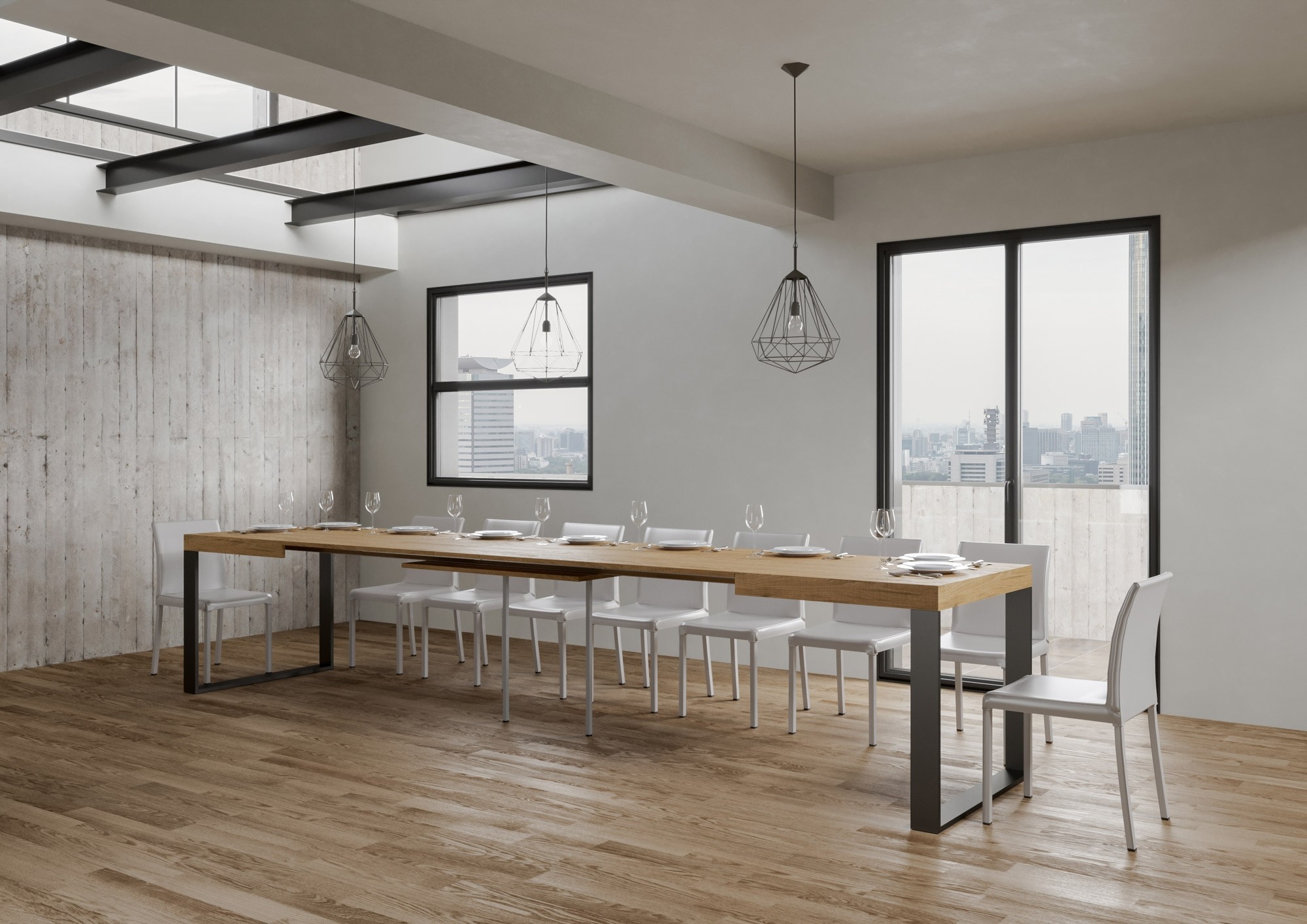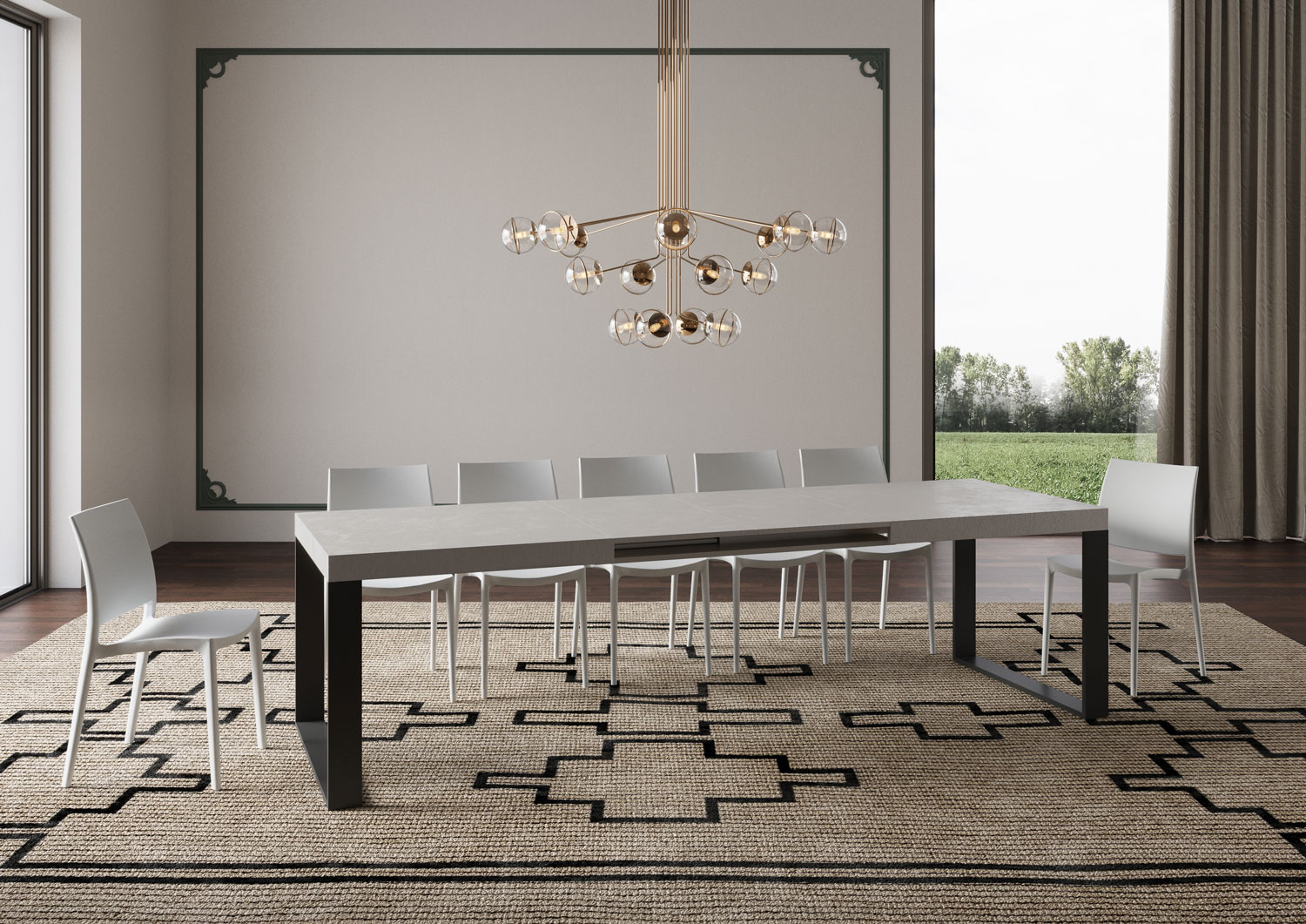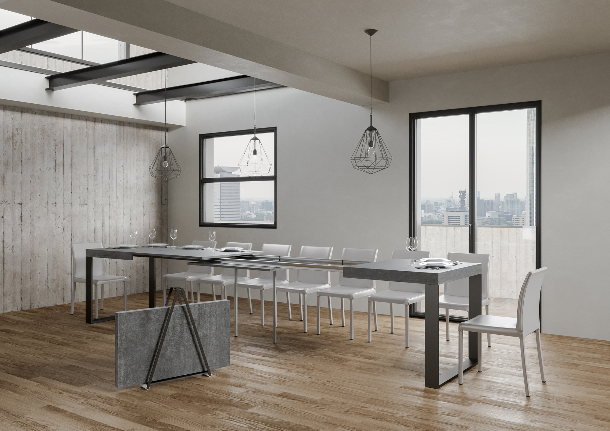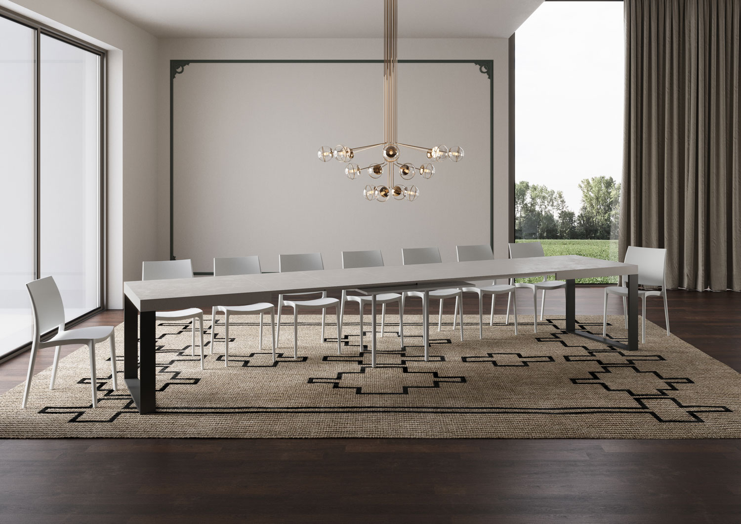 La table extensible Tecno peut s'étendre progressivement jusqu'à 440 cm capable d'accueillir 18 personnes.