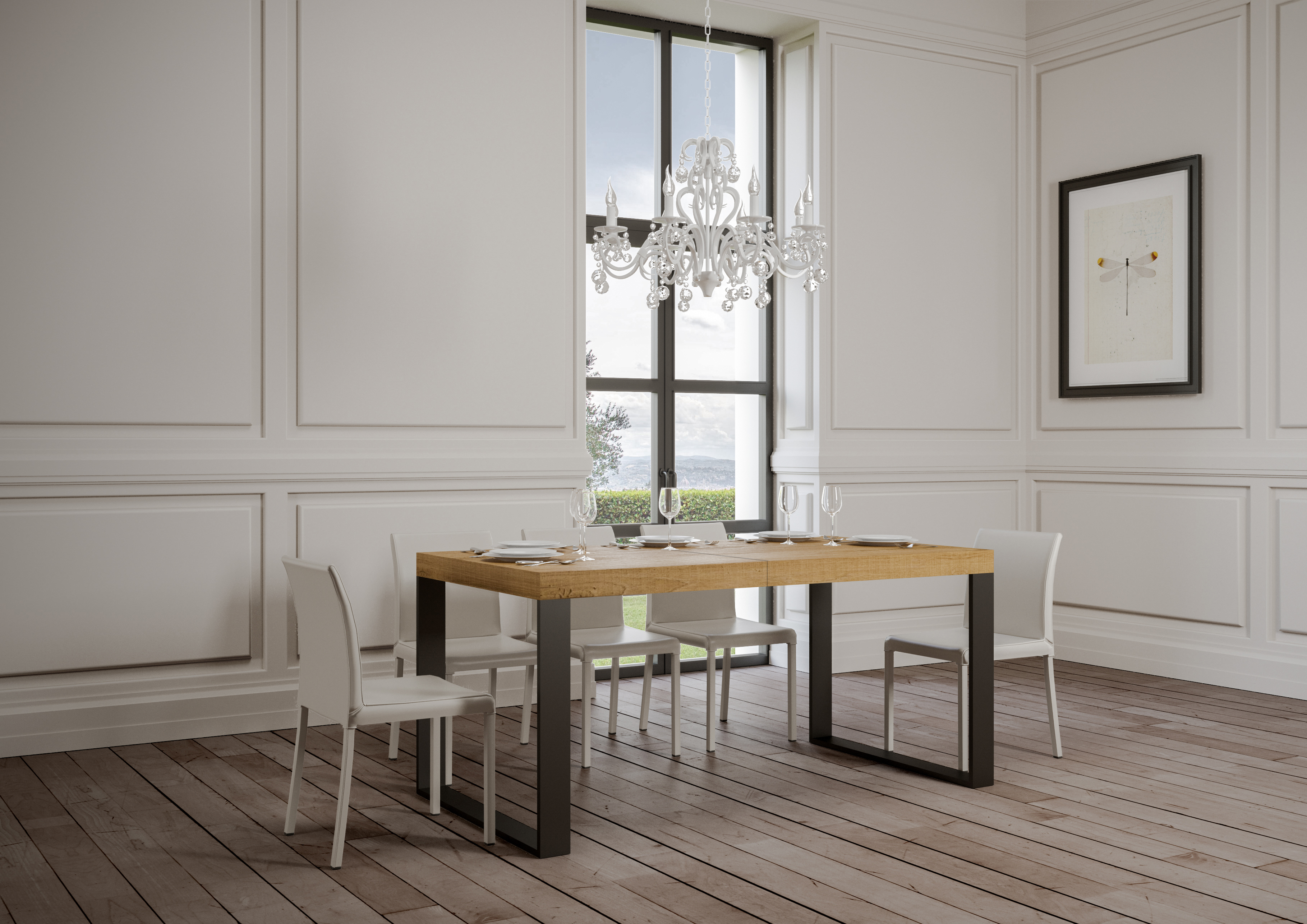 Table extensible Tecno Premium de 200 cm, dotée d'un design linéaire, simple et essentiel, cette table s'adapte à tous les styles d'aménagementet se révèle être le choix idéal à la fois comme table à manger et comme élément de décoration pour le salon, permettant d'accueillir vos invités avec style. La table extensible Tecno Premium peut s'étendre progressivement jusqu'à 304 cm capable d'accueillir 12 personnes. Table réalisée avec des panneaux en mélaminé, des pieds en fer, plateau et extensions usinés avec une finition de type Folding. Le système d'extension avec des guides télescopiques en aluminium rend la table stable et robuste même lorsqu'elle est totalement allongée, sans avoir besoin de supports supplémentaires. Lorsqu'elles ne sont pas utilisées, les extensions ne sont pas intégrées à la structure de la table et doivent donc être rangées ailleurs. Produit Itamoby Made in Italy Dimensions: Table fermée: L.200 P.90 H.77 cm Longueur avec 1 extension: 252 cm Longueur avec 2 extensions: 304 cm