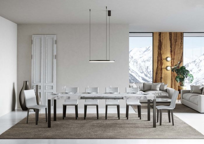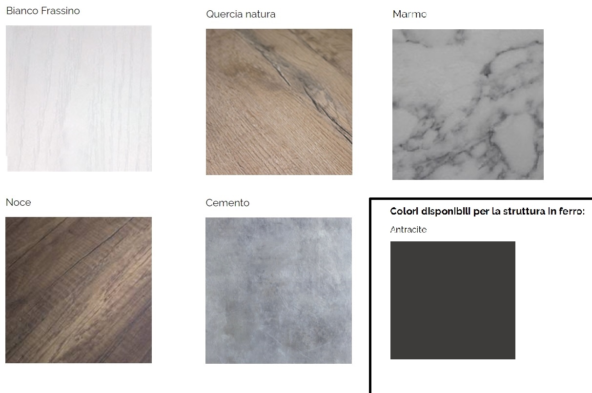Le plateau en microparticules de bois est disponible dans les finitions suivantes : frêne blanc, chêne naturel, noyer, béton et marbre. Les rallonges sont assorties à la finition du plateau.