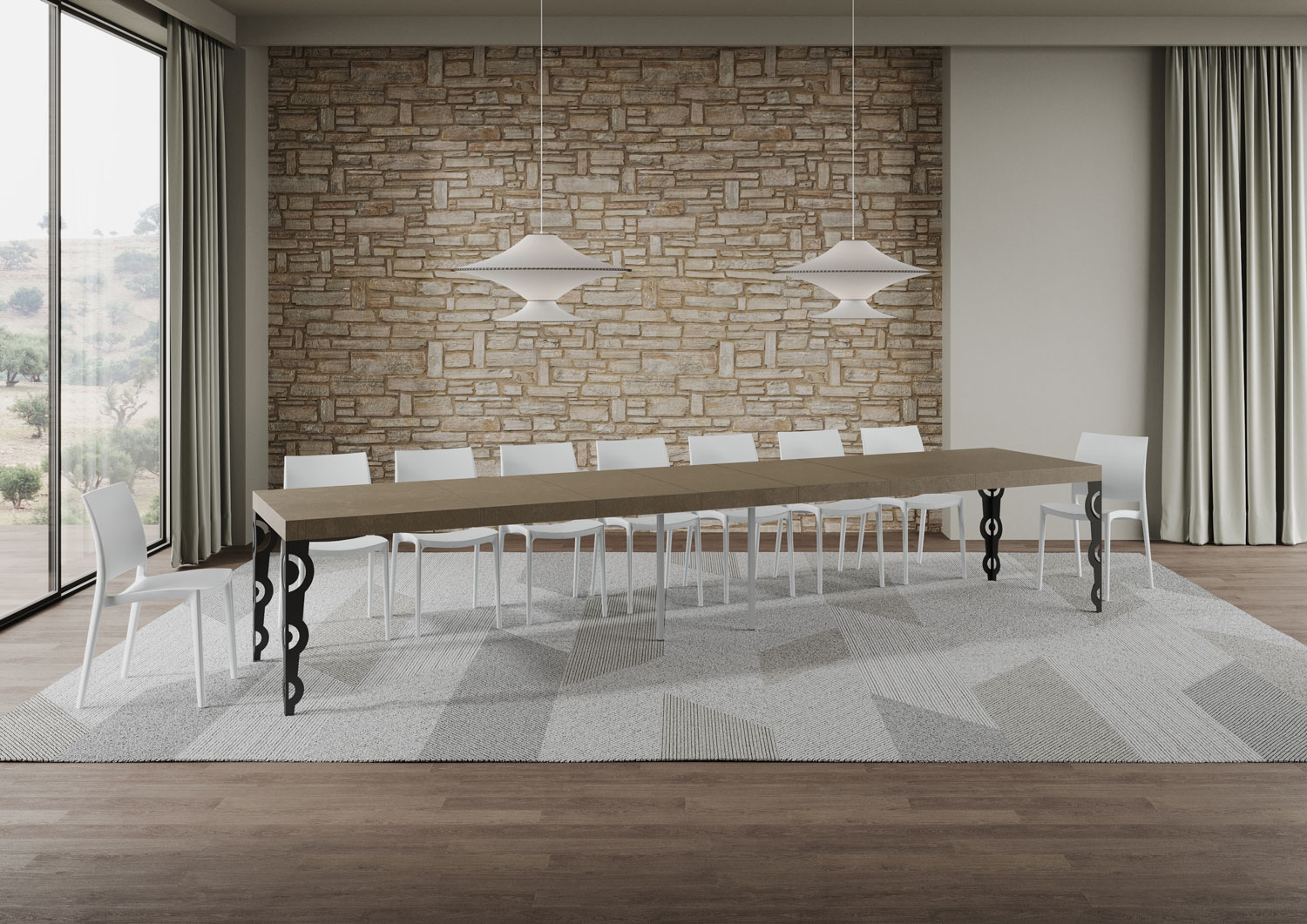 La table extensible Karamay Premium peut s'étendre progressivement jusqu'à 420 cm capable d'accueillir 18 personnes.
