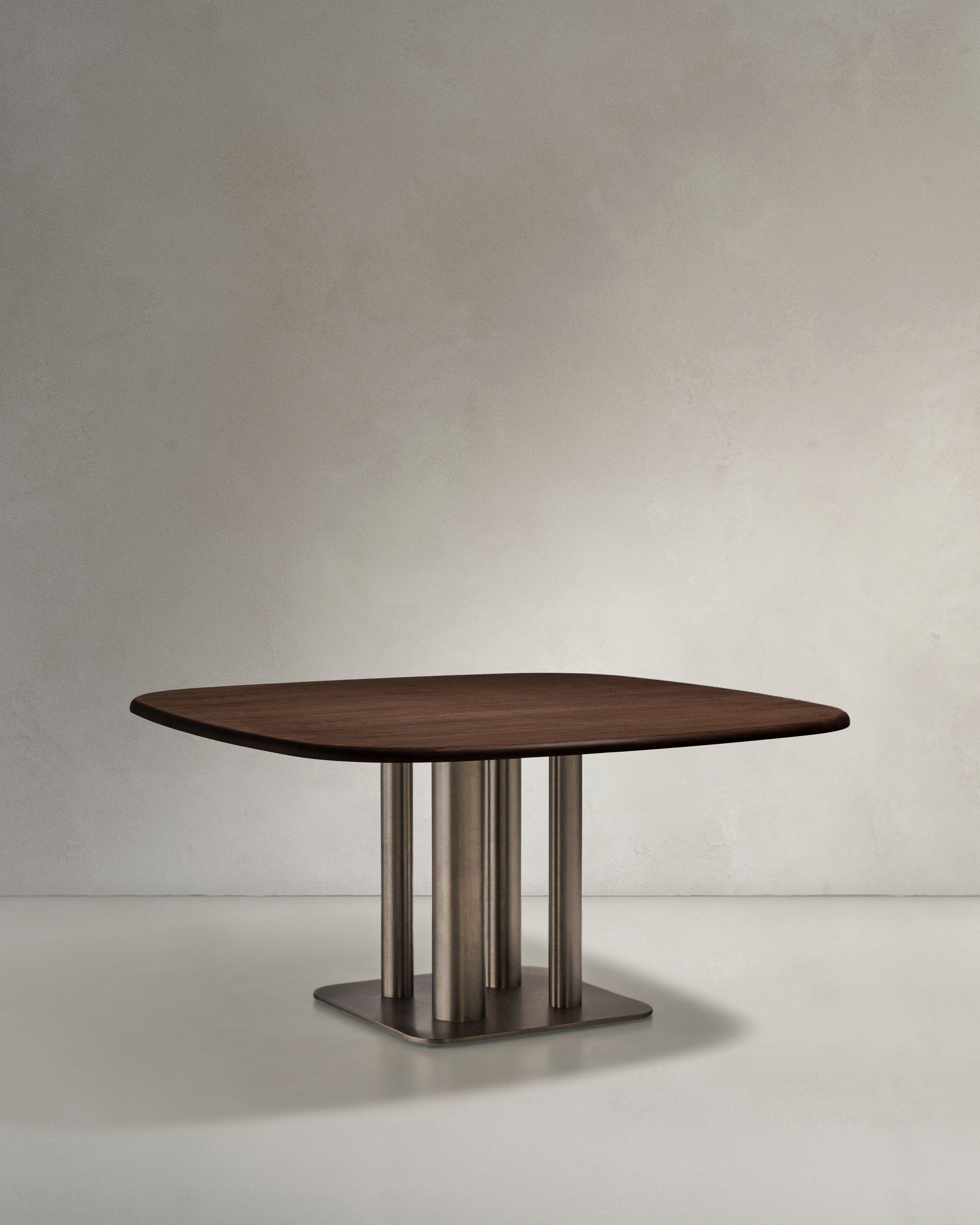 La table Melvar rend hommage à l'esthétique du milieu du siècle, réinterprétée dans une version contemporaine, où le raffinement s'exprime à travers des matériaux nobles et des détails sculpturaux. Le plateau, réalisé en placage de noyer de 0,6 mm avec une finition foncée sophistiquée, dégage chaleur et élégance, vous invitant à savourer des moments privilégiés. La courbure parfaite du bois, obtenue par pressage à membrane, et la finition polyuréthane garantissent une résistance et une durabilité exceptionnelles, préservant la beauté de la surface au fil du temps. Le caractère emblématique de cette pièce est sublimé par les pieds en acier inoxydable, disponibles en différents diamètres et dotés d'un effet brossé sophistiqué qui réduit la visibilité des traces de doigts. Ce contraste de matériaux et de volumes crée une silhouette unique et sculpturale capable de transformer n'importe quelle salle à manger en un espace design contemporain, sans sacrifier l'esprit intemporel qui caractérise la collection. L'ensemble est complété par des pieds réglables, conçus pour adapter la table à n'importe quelle surface et assurer une stabilité maximale. Pouvant accueillir jusqu'à 4 personnes, cette table devient le centre de vos réunions et célébrations, alliant fonctionnalité et esthétique dans les moindres détails.