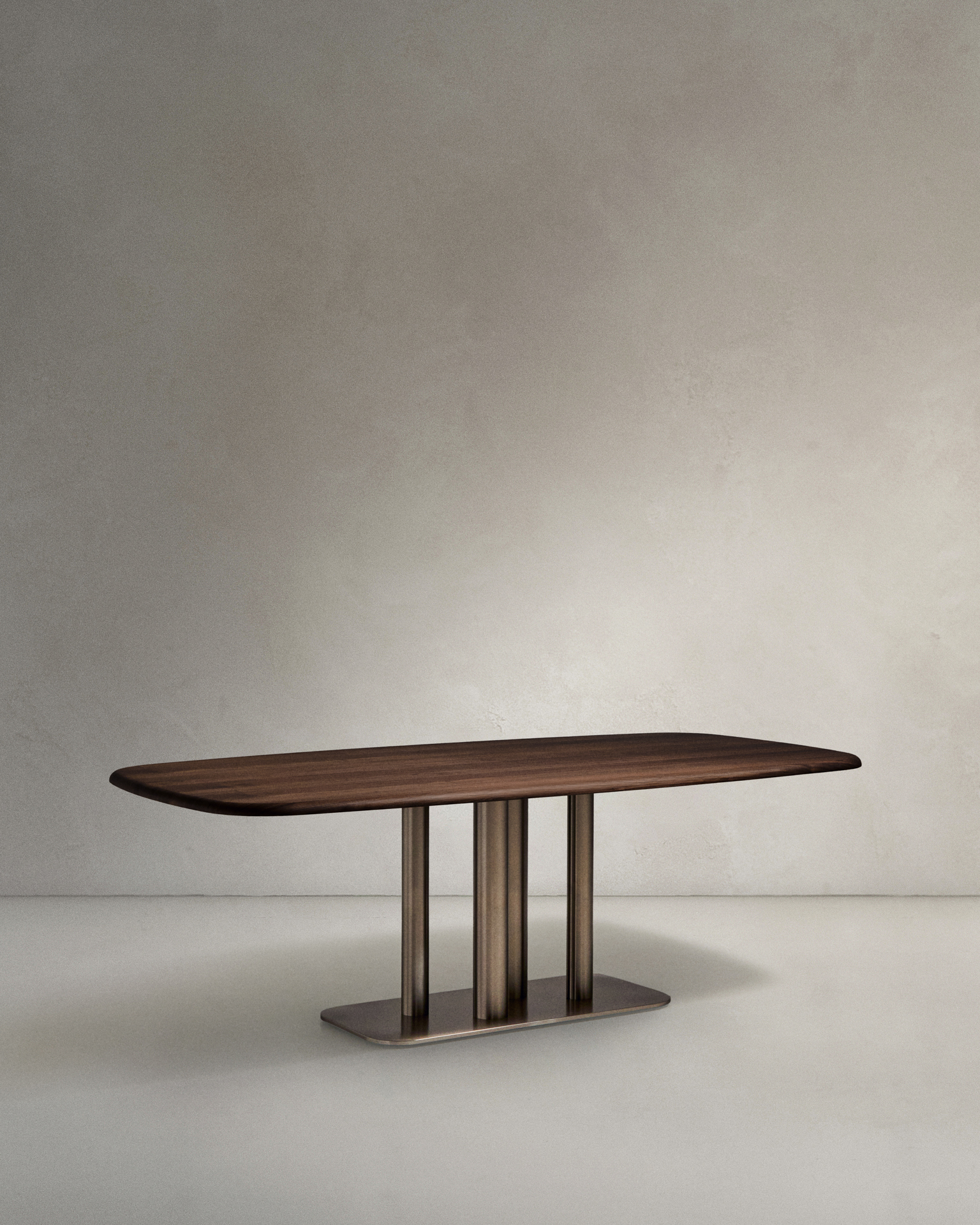 La table Melvar rend hommage à l'esthétique du milieu du XXe siècle, réinterprétée dans un esprit contemporain où le raffinement s'exprime à travers des matériaux nobles et des détails sculpturaux. Son plateau, réalisé en placage de noyer de 0,6 mm avec une finition foncée sophistiquée, dégage chaleur et élégance, invitant à partager des moments privilégiés. La courbure parfaite du bois, obtenue par pressage à membrane, et la finition polyuréthane garantissent une résistance et une durabilité exceptionnelles, préservant ainsi la beauté du plateau au fil du temps. Le caractère iconique de la pièce est sublimé par ses pieds en acier inoxydable, disponibles en différents diamètres et finis avec un élégant effet brossé qui atténue les traces de doigts. Ce contraste de matériaux et de volumes crée une silhouette sculpturale unique, capable de transformer n'importe quelle salle à manger en un espace design contemporain, sans rien perdre de l'intemporalité qui caractérise la collection. L'ensemble est complété par des pieds réglables, conçus pour adapter la table à toutes les surfaces et assurer une stabilité optimale. Pouvant accueillir jusqu'à 10 convives, cette table devient le point central des réunions et des célébrations, alliant fonctionnalité et esthétique dans les moindres détails.