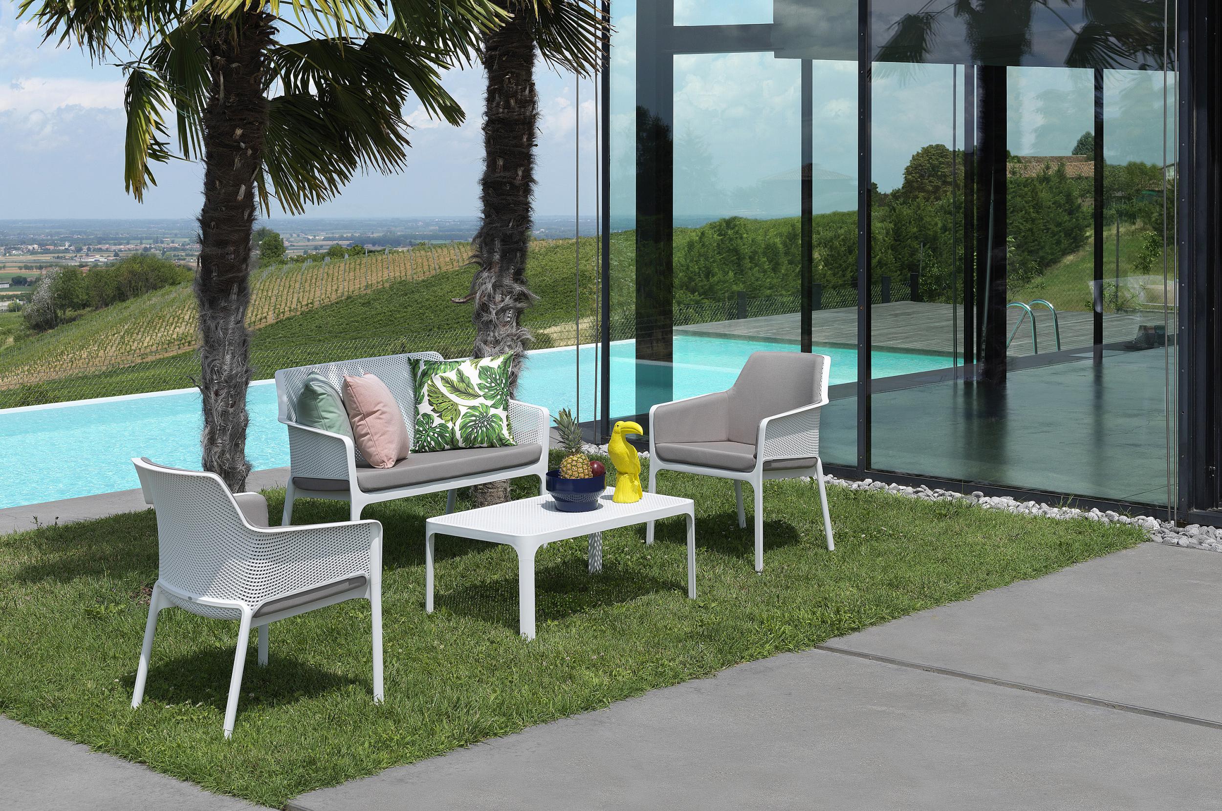 Élégante table d'appui en résine de fibre de verre colorée dans la masse avec un plateau rectangulaire caractérisé par un motif ajouré qui reprend le leitmotiv de toute la collection Net.