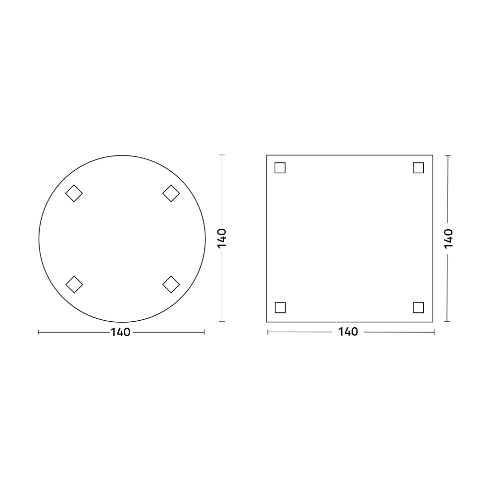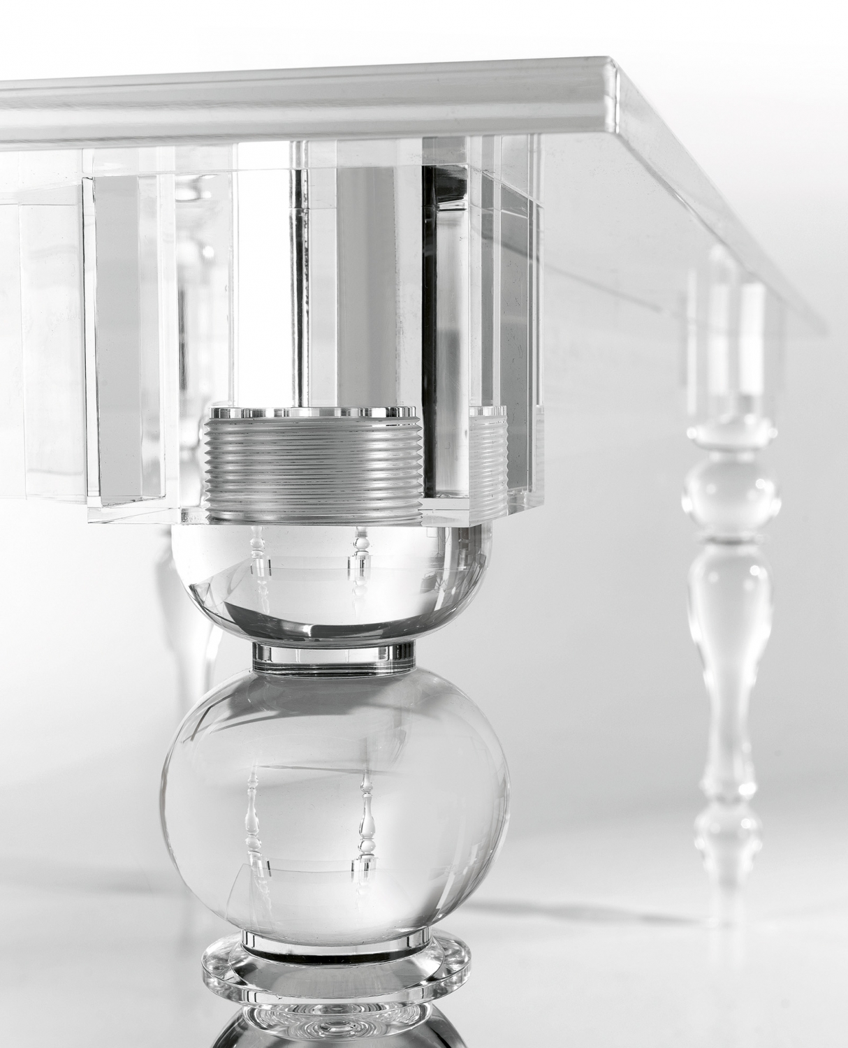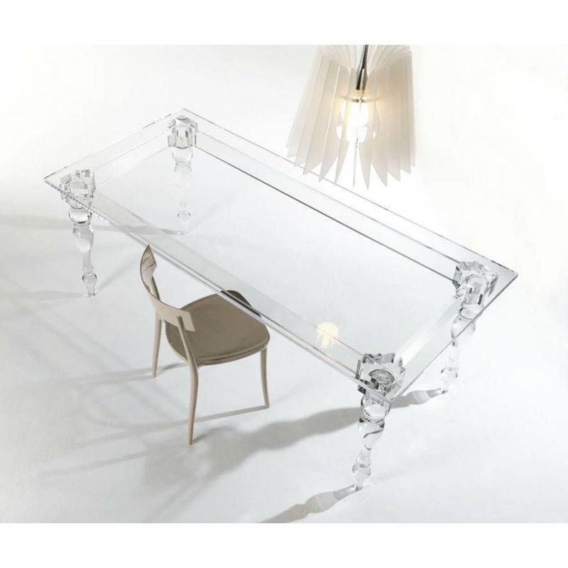 Table avec structure et plateau entièrement en méthacrylate, recyclable et adapté à un usage extérieur.