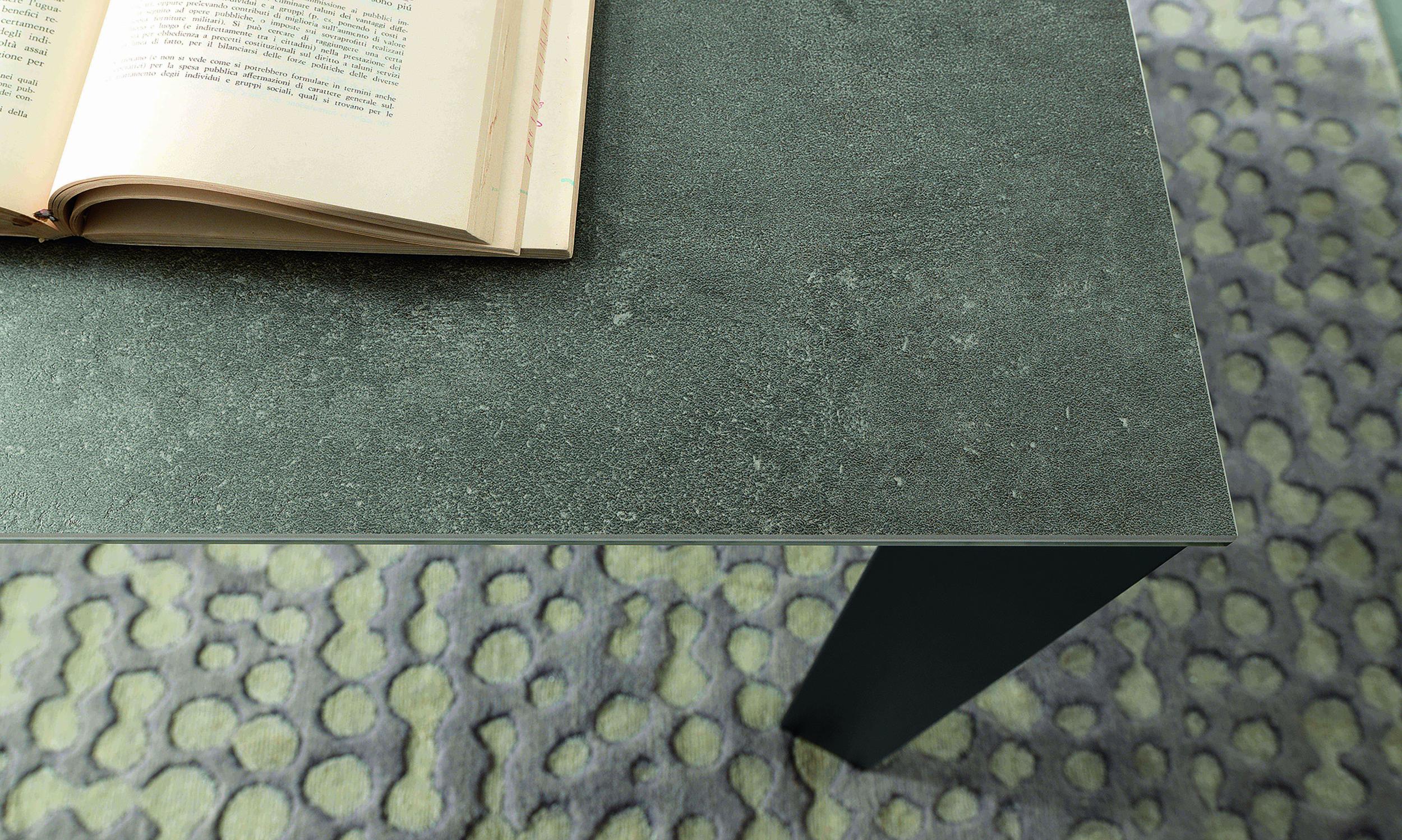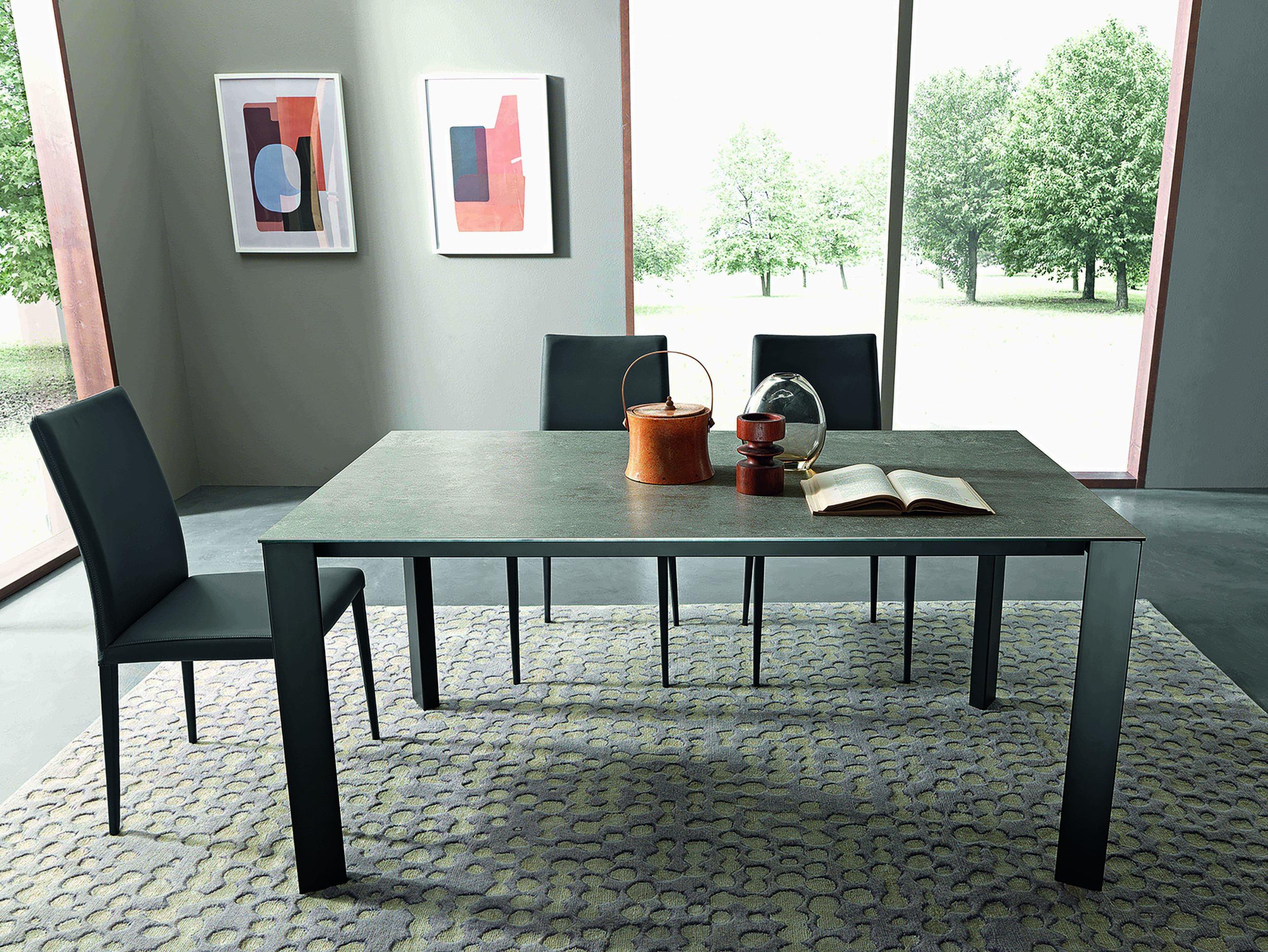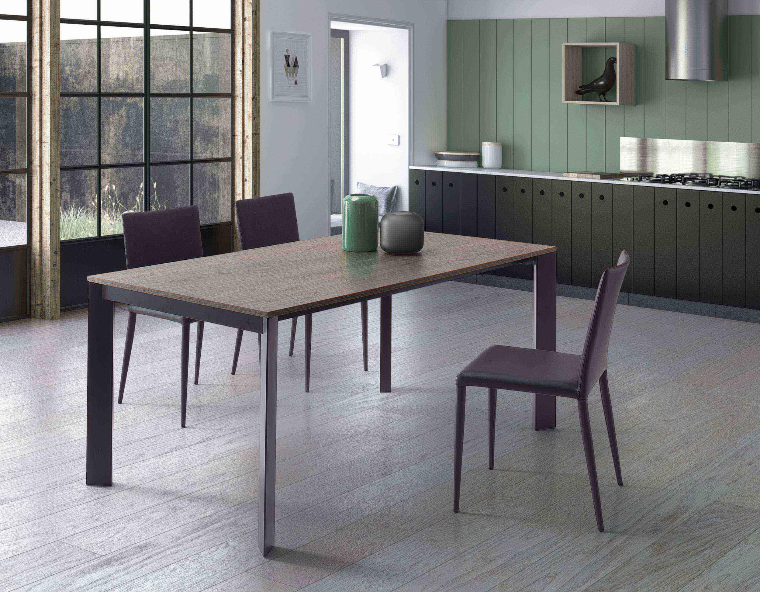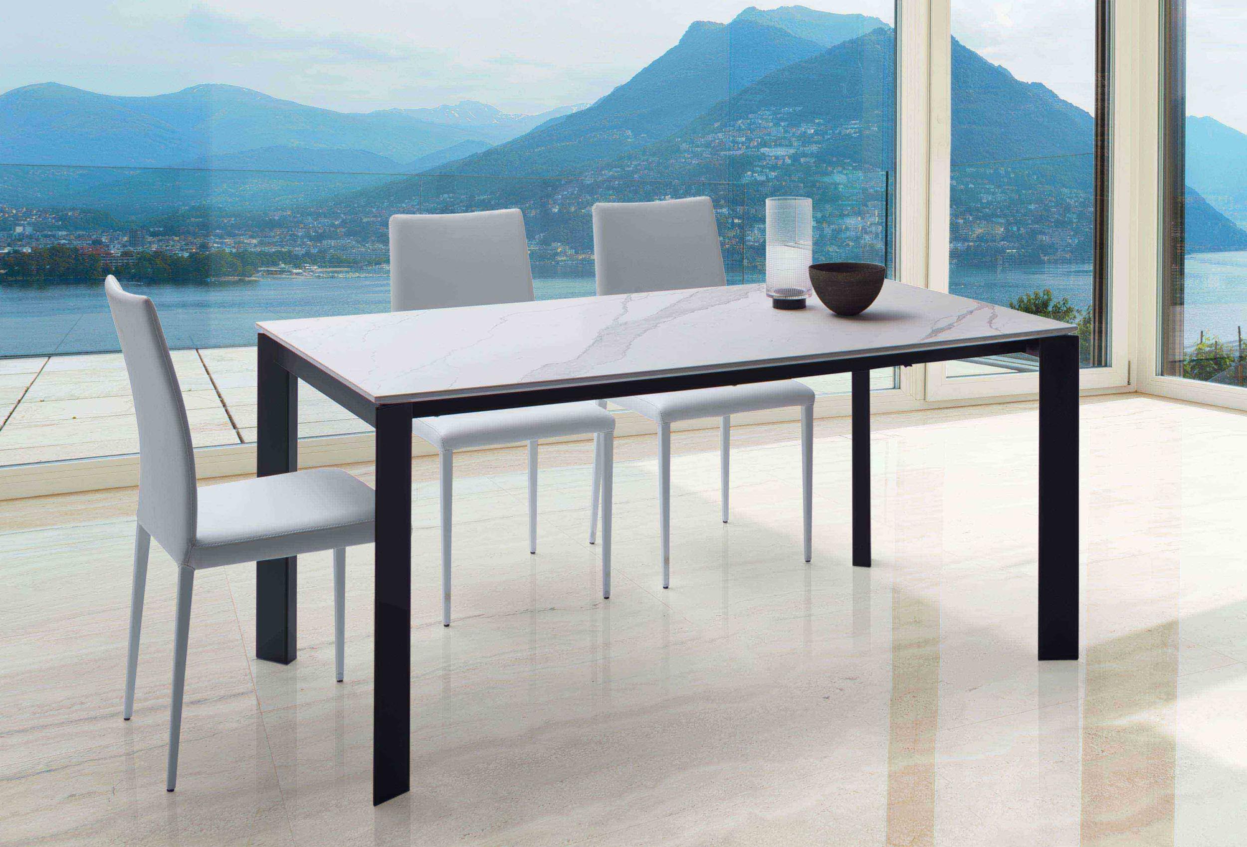 Table à manger extensible, structure en métal, mécanisme télescopique, plateau en mélamine, verre, bois, effet mortier ou céramique, rallonge interne type livre.