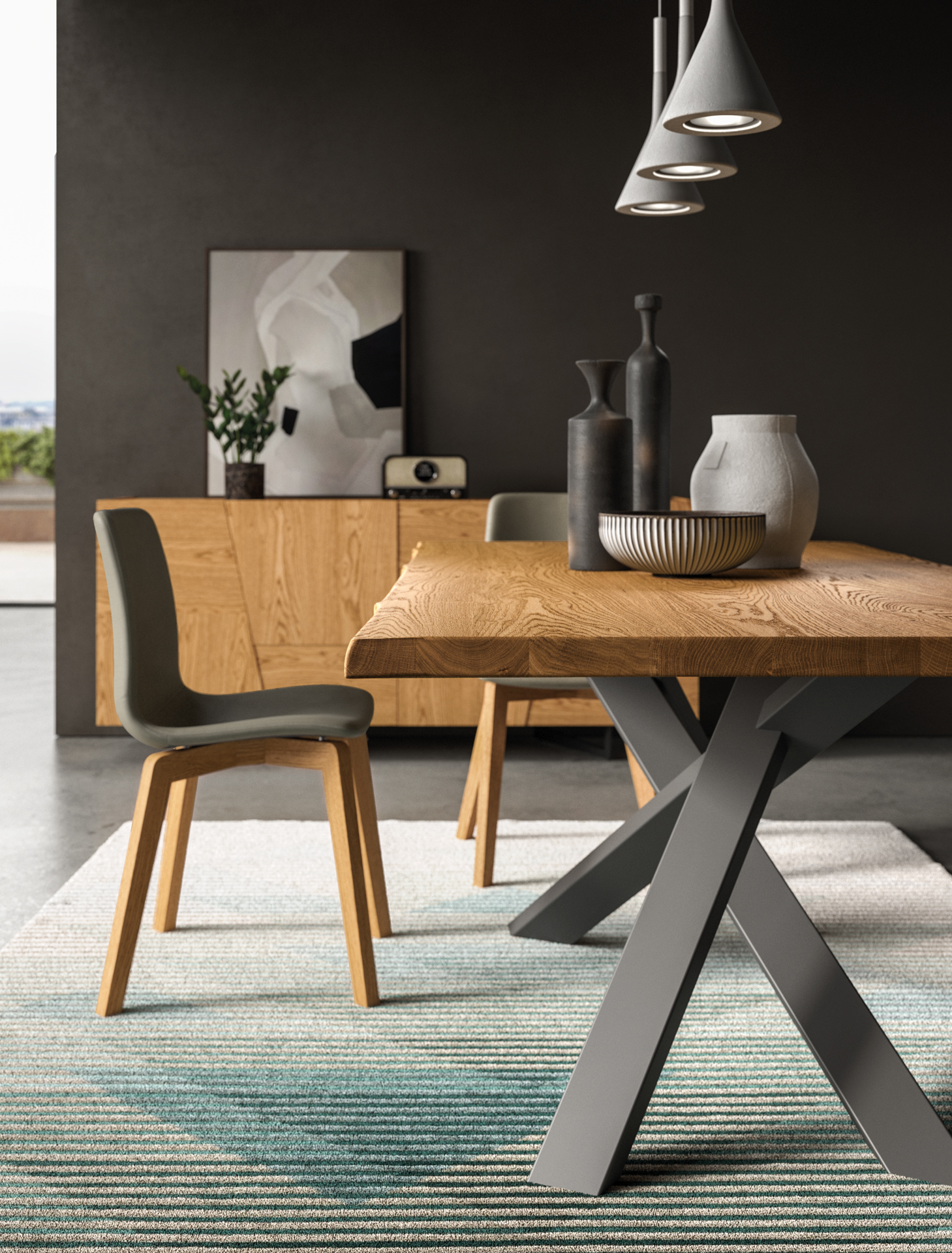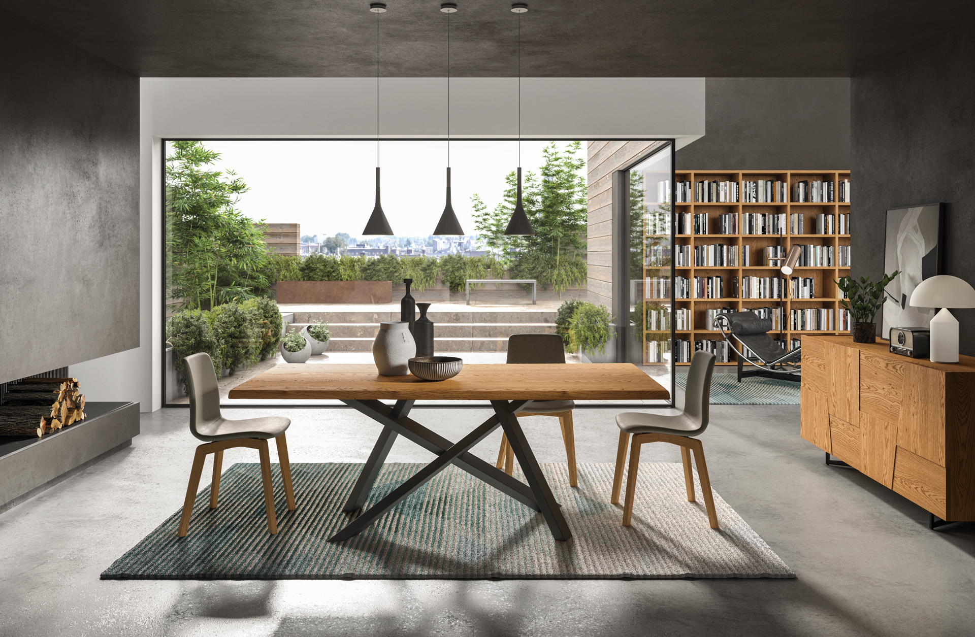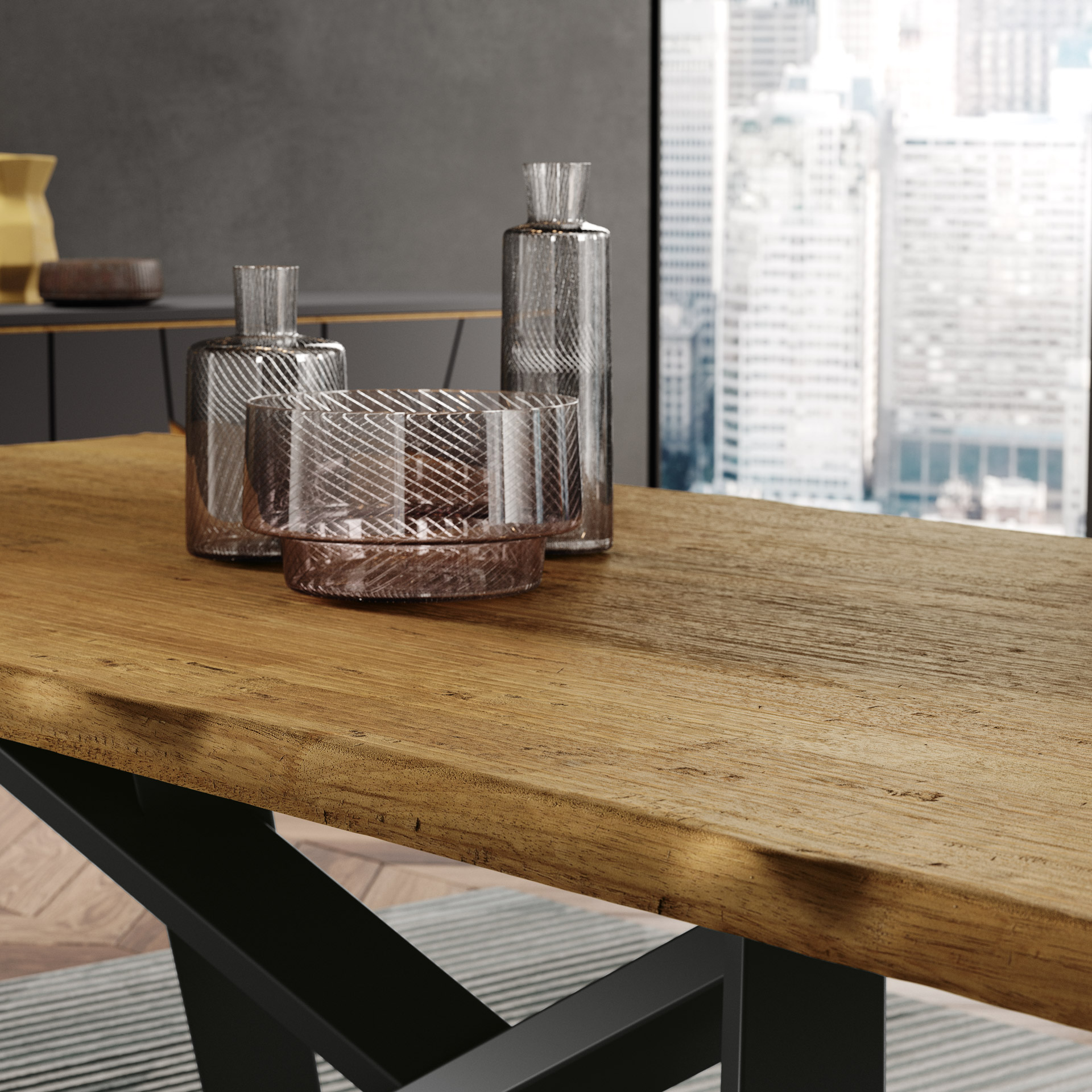 La structure de la table est constituée d'éléments découpés au laser et soudés électroniquement en une seule pièce, assurant non seulement une stabilité exceptionnelle mais également un impact esthétique notable. Le bord de la table, en bois véritable, peut être choisi avec une finition carrée pour un look moderne ou avec un bord écorcé pour rehausser le naturel et l'authenticité du bois.
