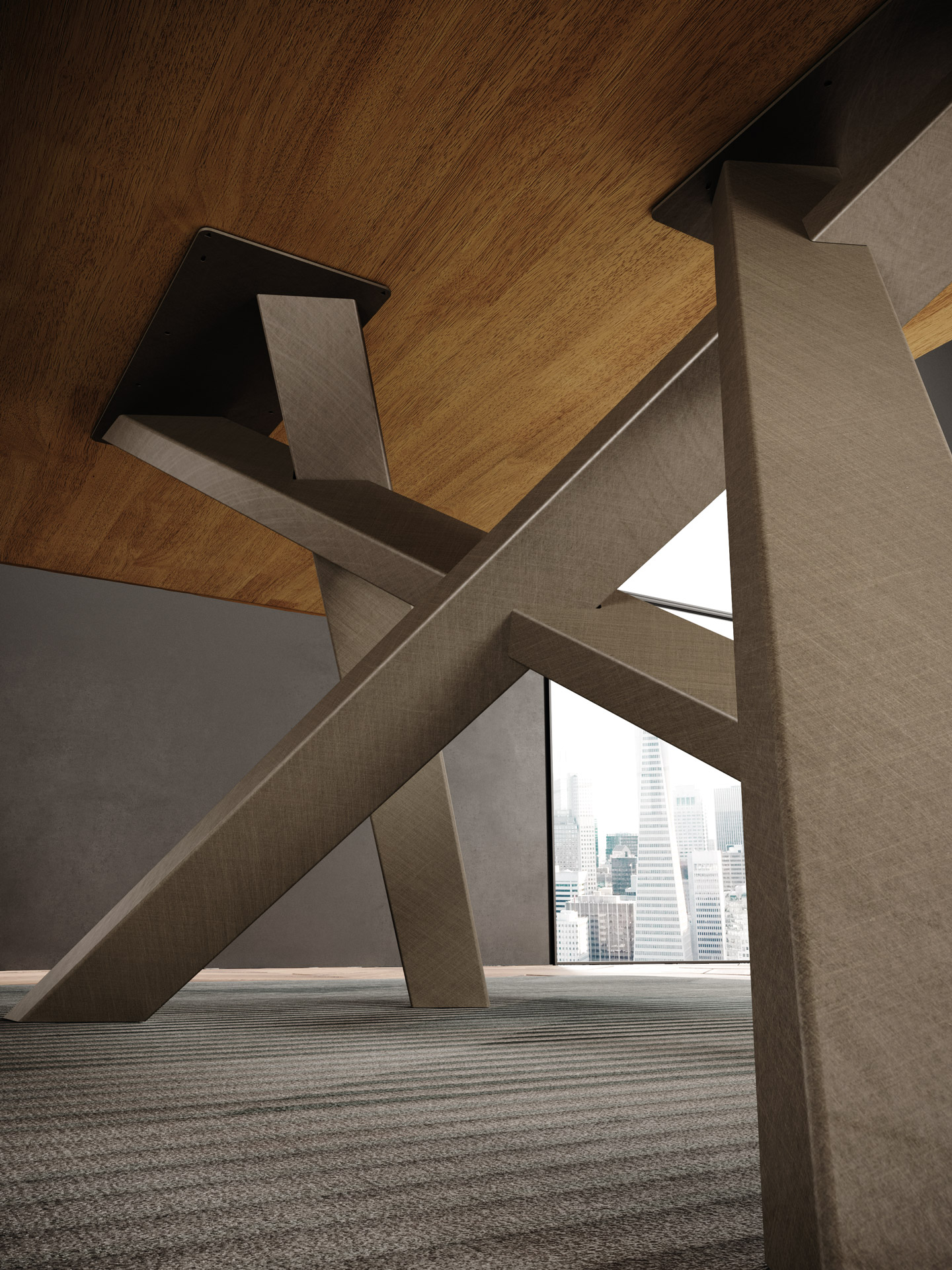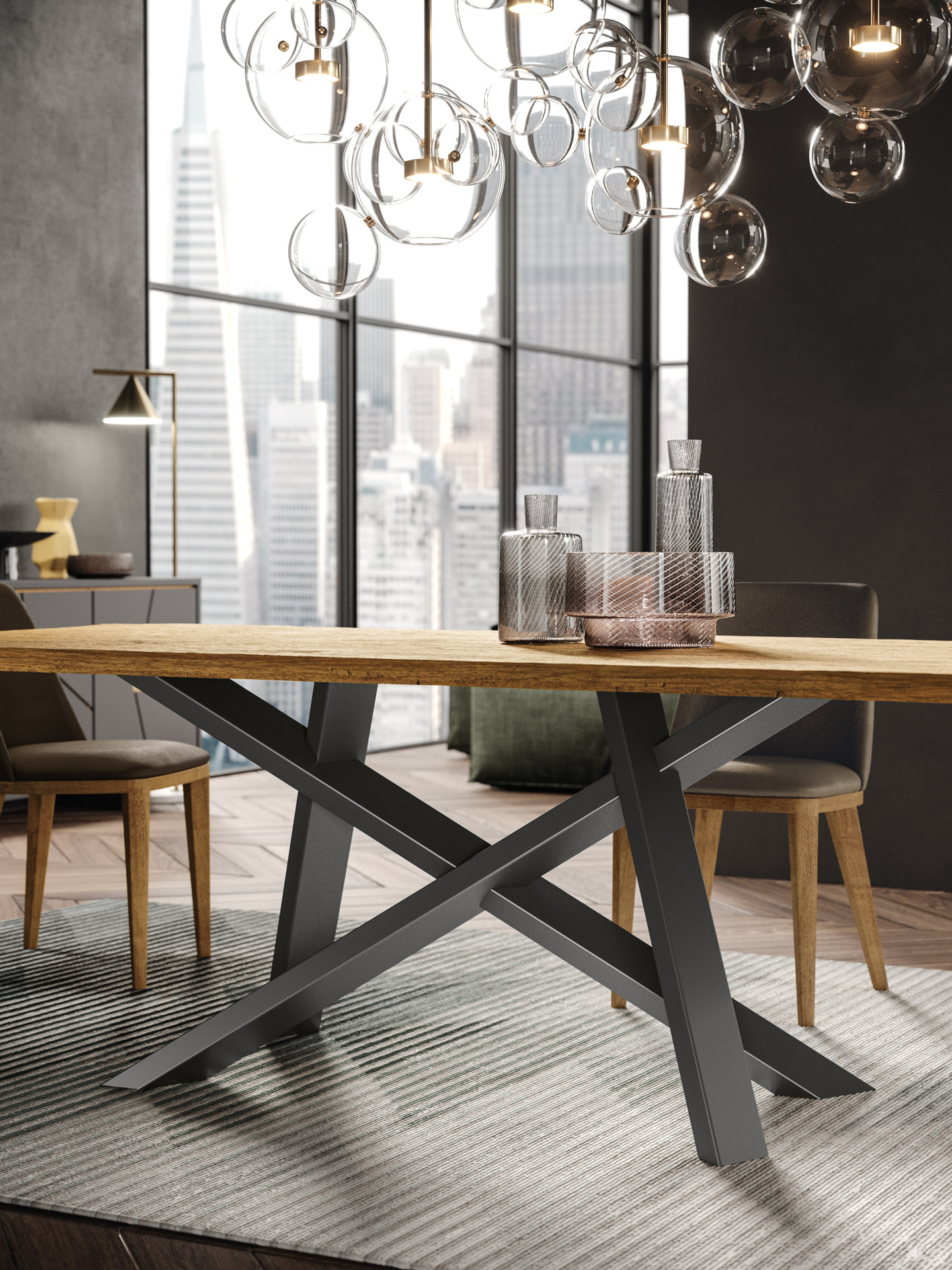 Le piètement de la table Crossing est un chef-d'œuvre de design et de qualité : réalisé avec des profilés en fer de grande section, peints avec une finition époxy anti-rayures, il offre une robustesse sans égal. Vous pouvez choisir parmi toutes les couleurs de l'échelle RAL pour personnaliser la finition du fer, garantissant ainsi que la table s'intègre parfaitement à votre style.