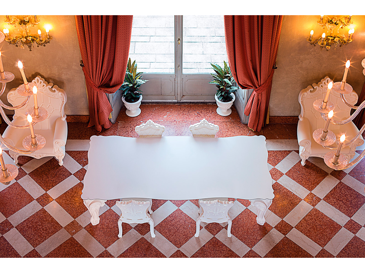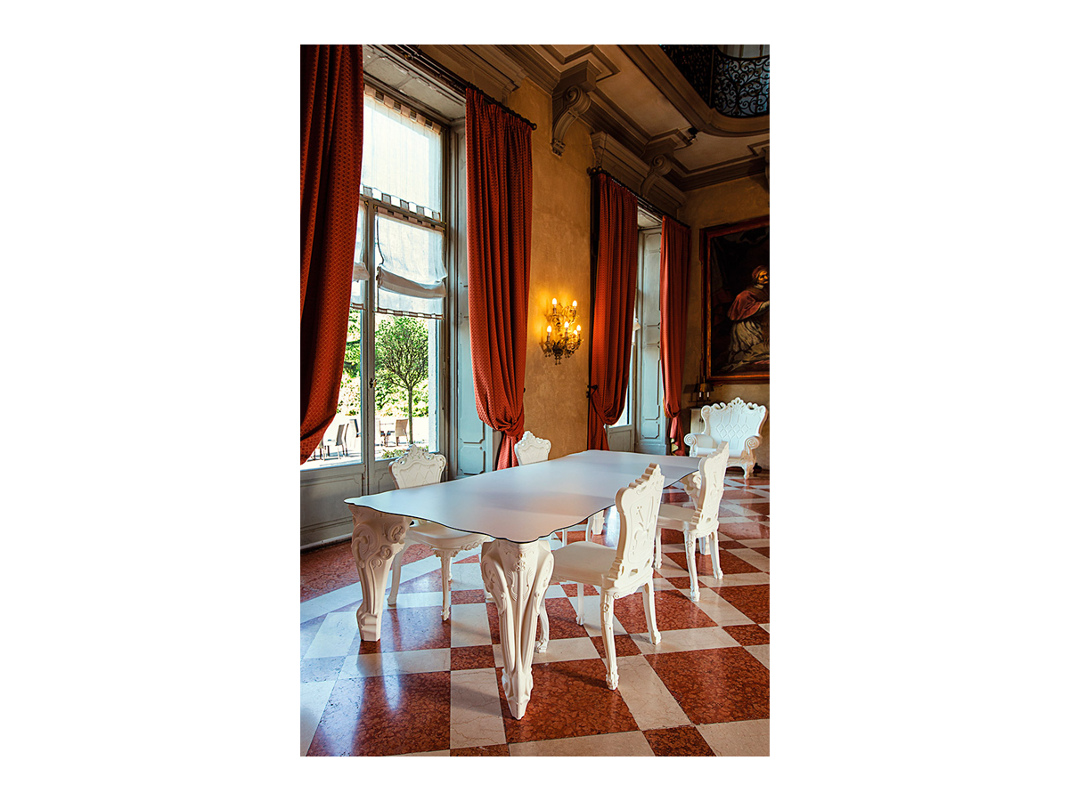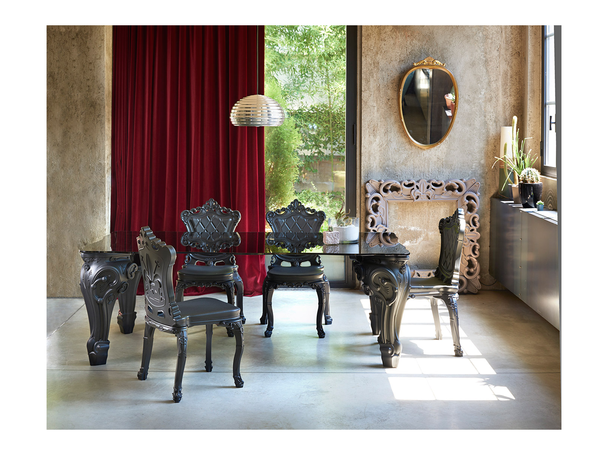 La table Sir of Love est conçue par Graziano Moro et Renato Pigatti dans la collection Design of Love. Les majestueux pieds d'angle de la table sont en polyéthylène, le plateau est en verre trempé fumé, donnant le choix de l'aspect fini du meuble. Le choix de la couleur se réfère aux pieds de la table.