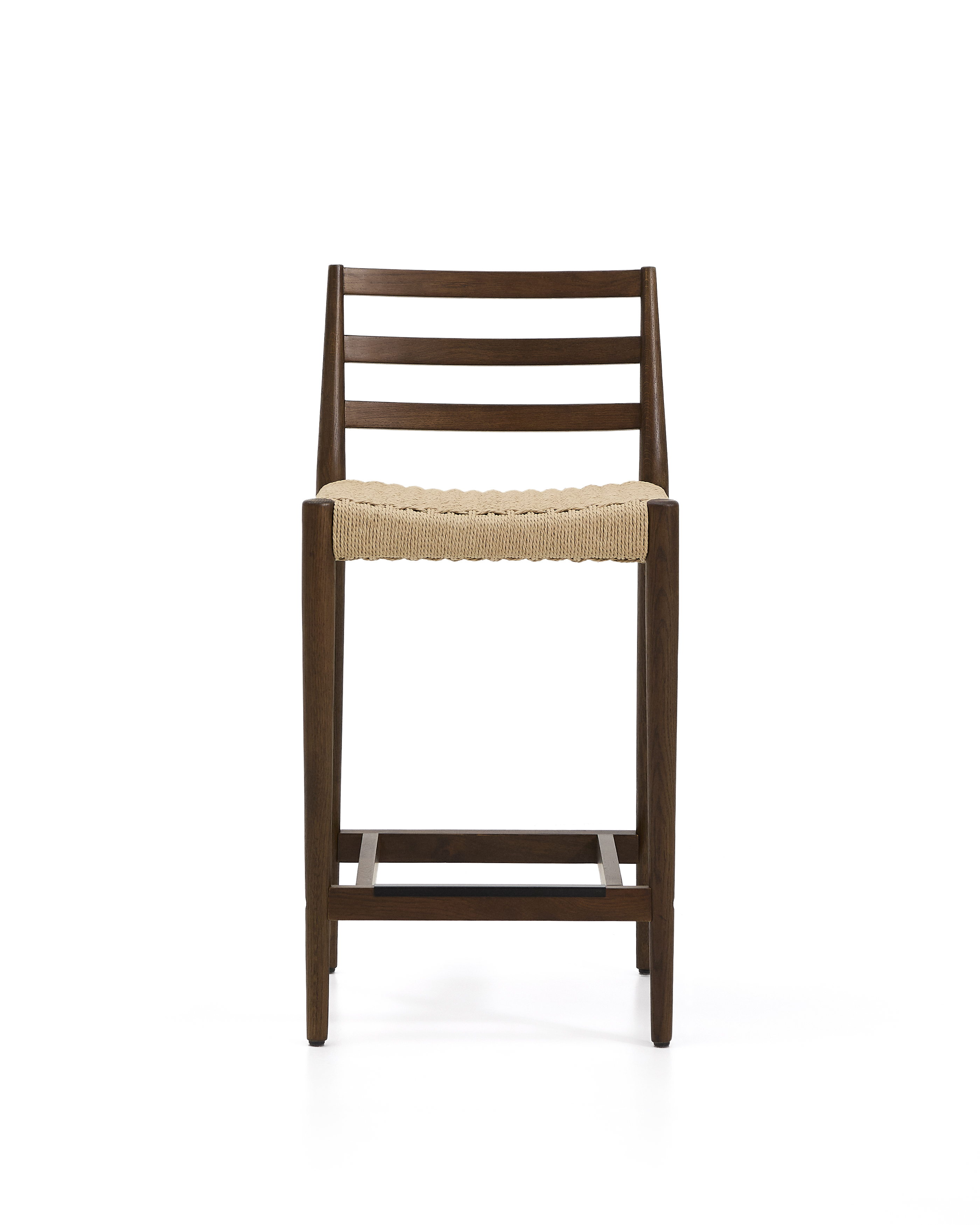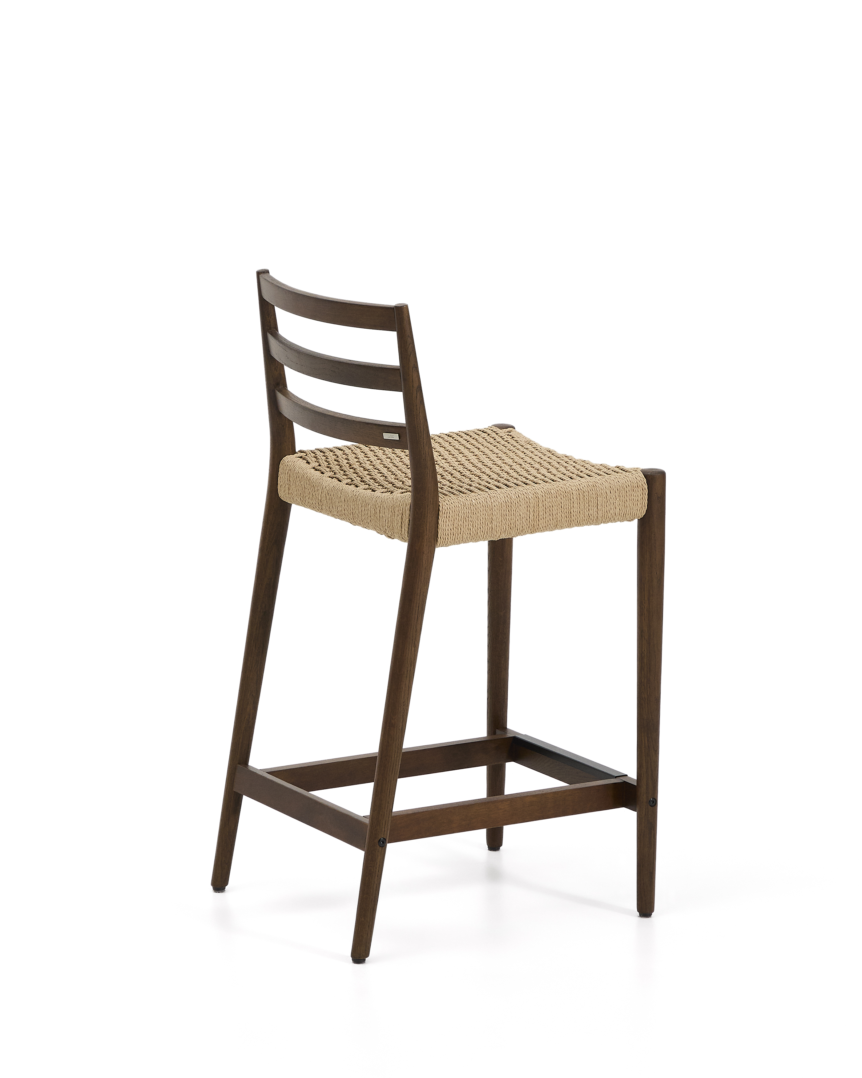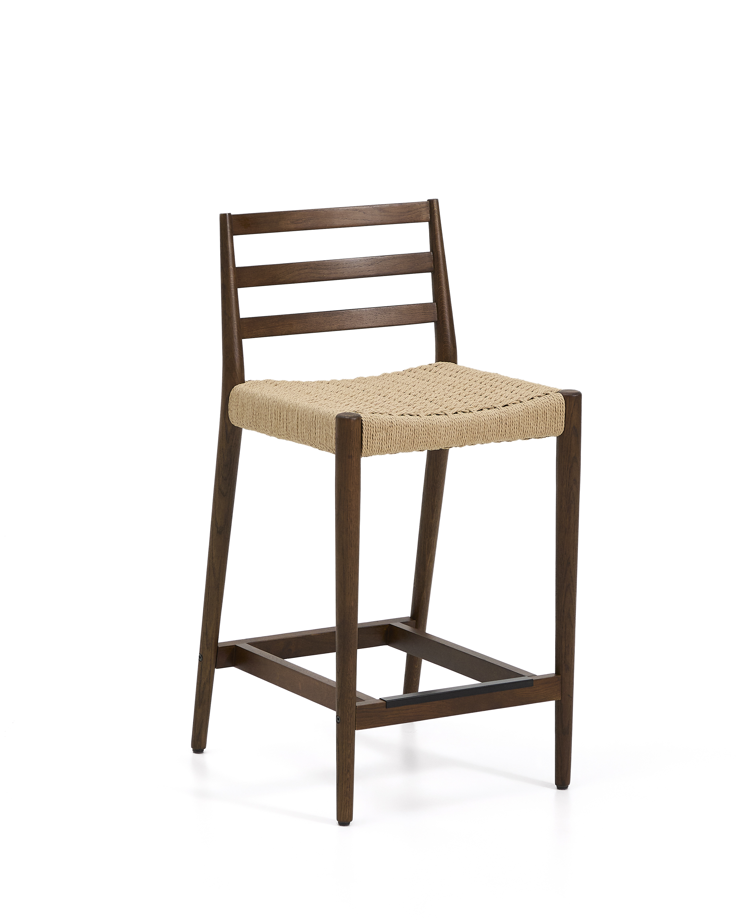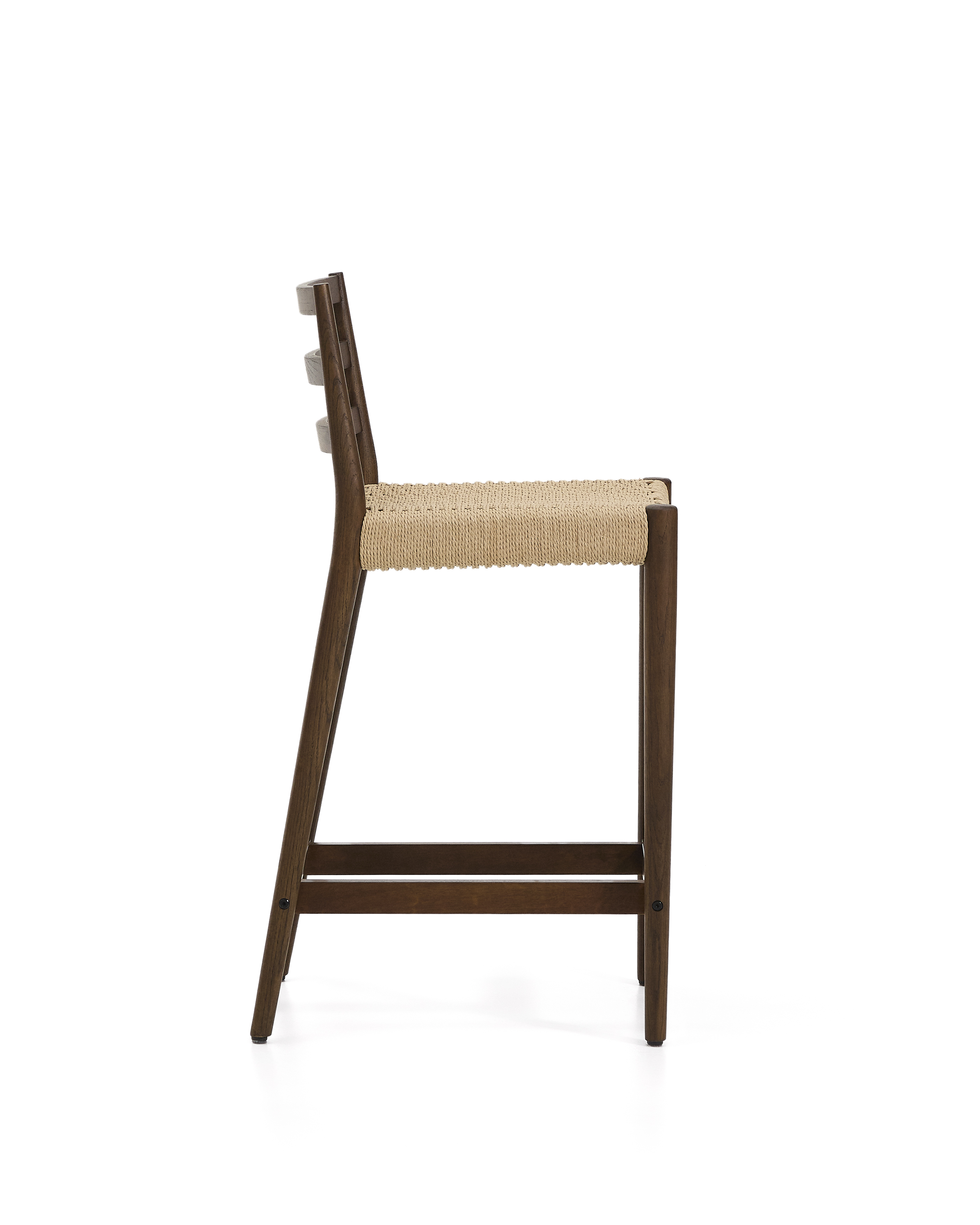 Tabouret Analy avec dossier en chêne massif finition noyer et assise en corde, 65 cm, FSC 100%