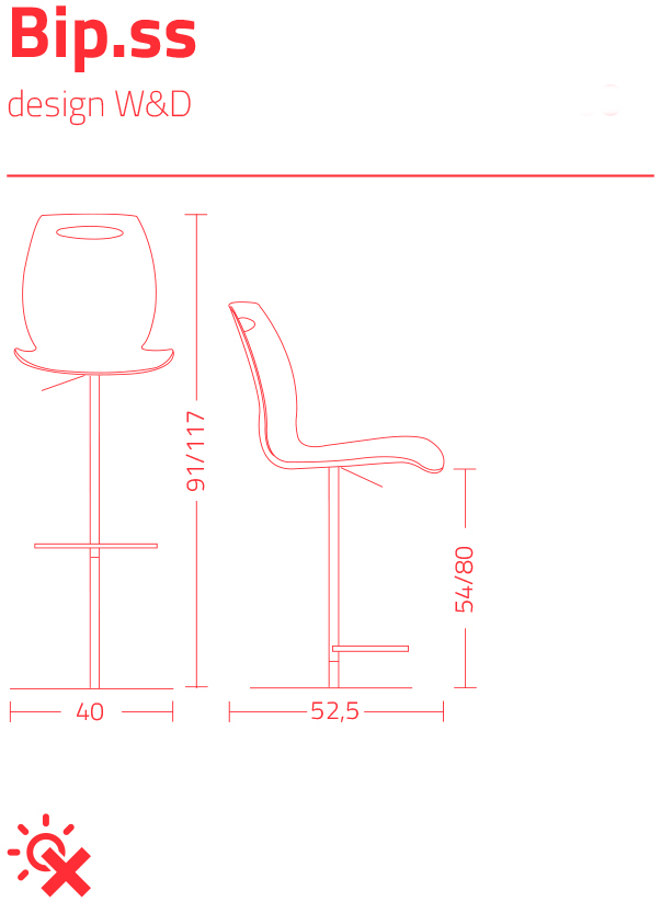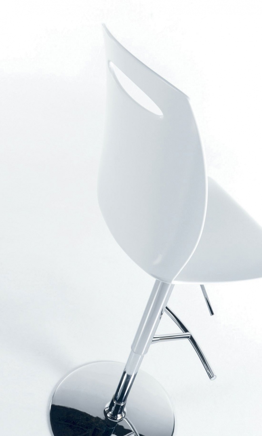 Tabouret réglable en hauteur avec structure en aluminium et acier, piston en acier et siège pivotant en technopolymère composite blanc.