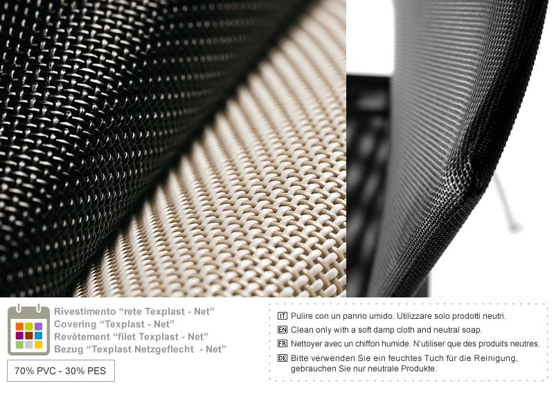 Net est une maille en matière synthétique, lavable et transpirante qui rend le siège très confortable.