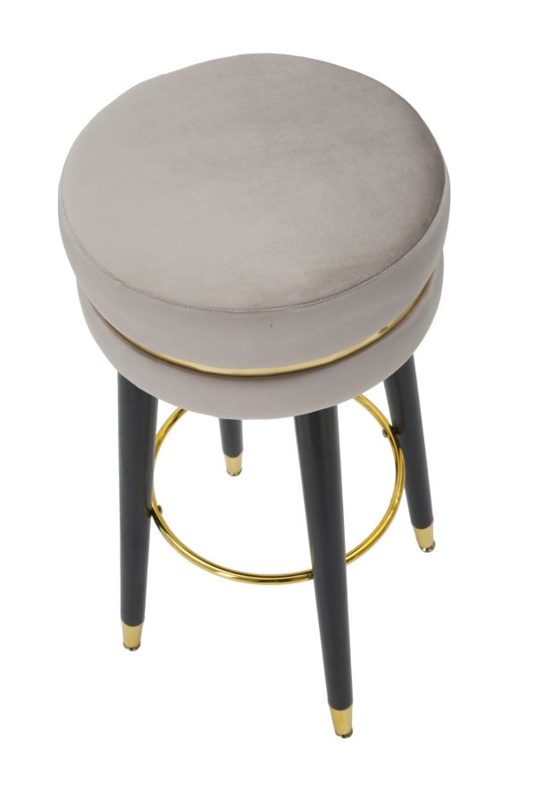 Tabouret de bar en bois et velours gris. Sièges avec une finition dorée inspirés des cabines d'essayage des grandes stars d'Hollywood. Idéal à placer dans la chambre ou dans le salon pour se sentir comme une star.
