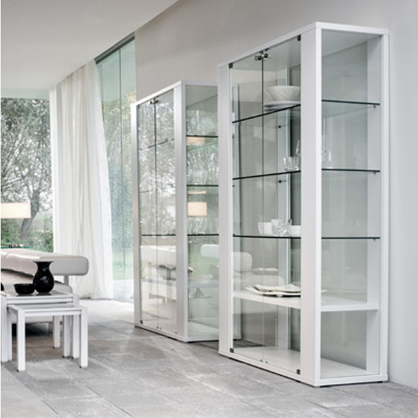 Vitrine avec côtés, dos, portes et étagères en bois en verre trempé transparent.