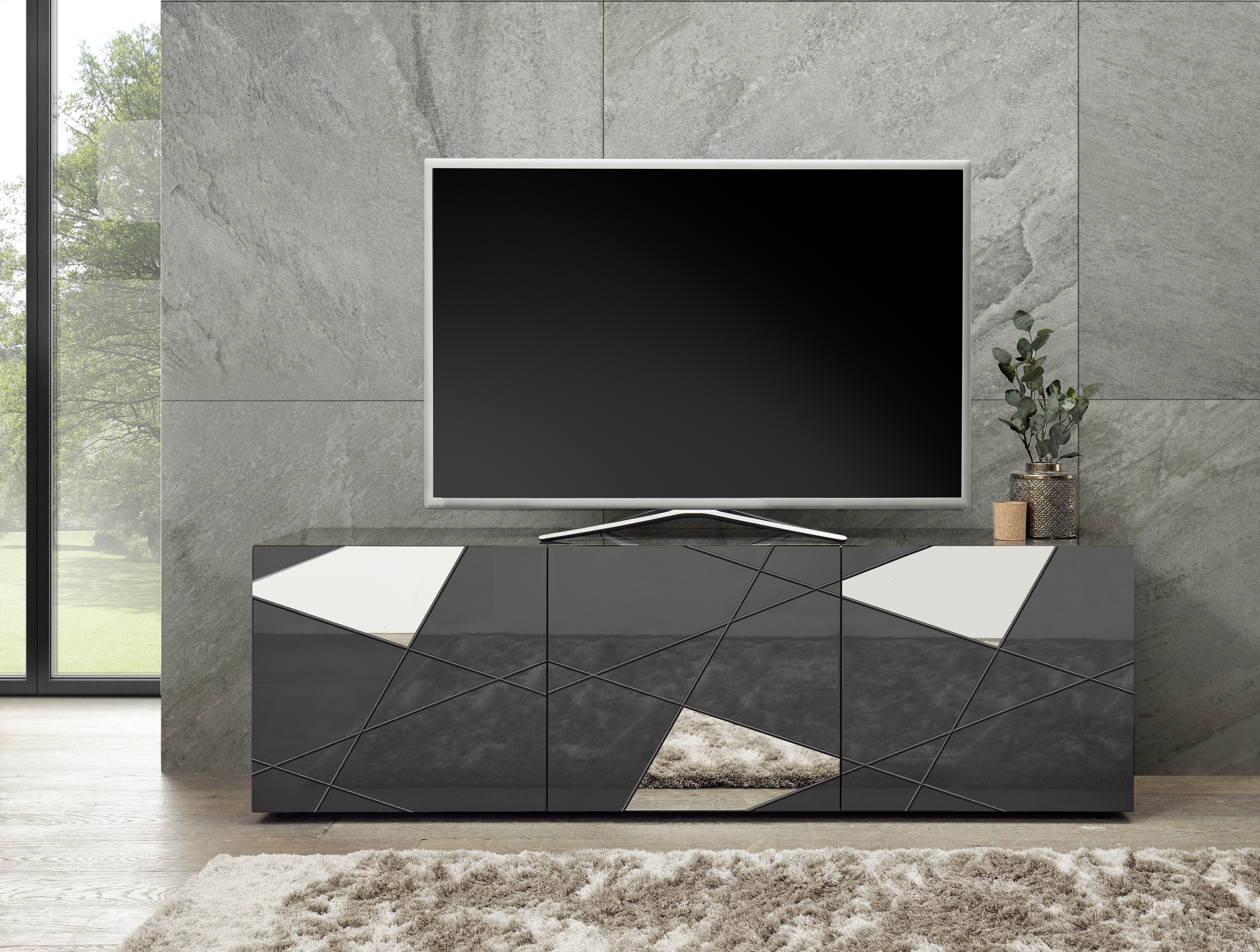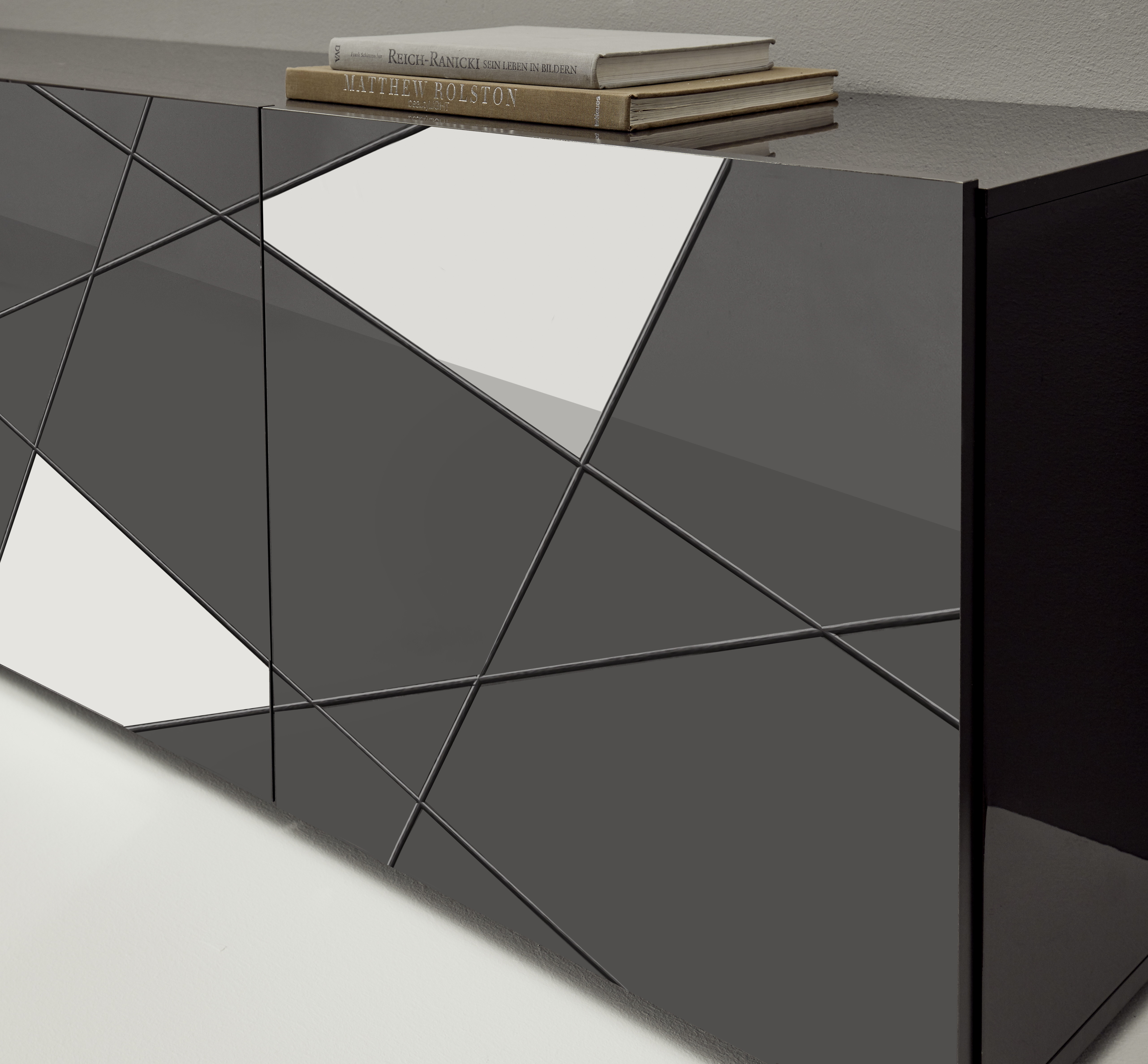 | Finition | Gris laqué brillant avec sérigraphies et miroirs |